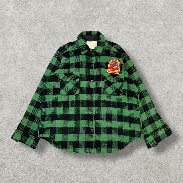 アメリカ製 Melton(メルトン)のウールシャツジャケット。グリーン×ブラックのバッファローチェック柄に、胸にはNORTH AMERICAN HUNTING CLUBのワッペンが縫い付けられた一点物仕様。程よく厚みのあるウール素材で、シャツとしてもライトアウターとしても活躍します。無骨なワークスタイルやアメカジ、ハンティングテイストが好きな方におすすめです。全体的に使用感はありますが、雰囲気を損なう大きなダメージはありません。