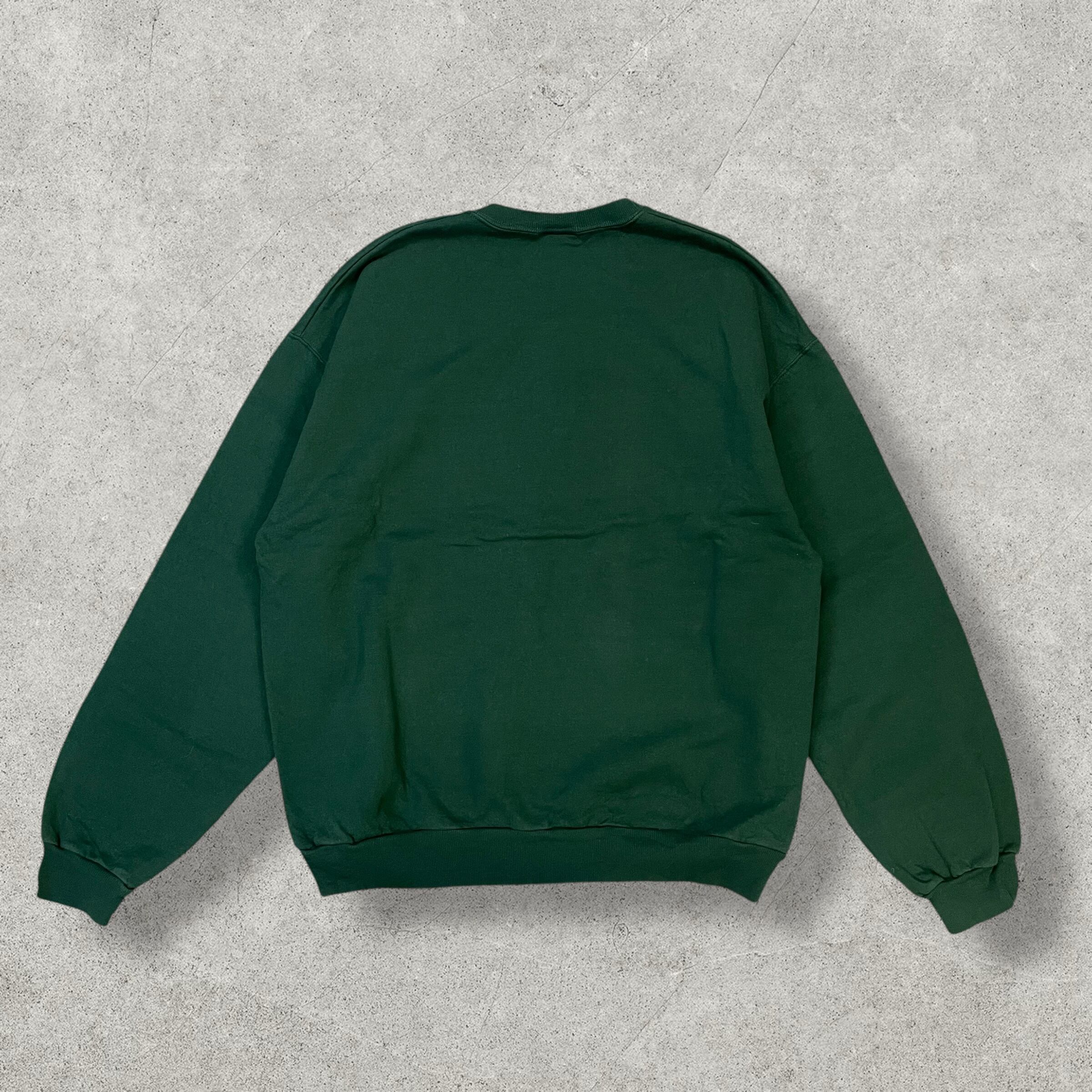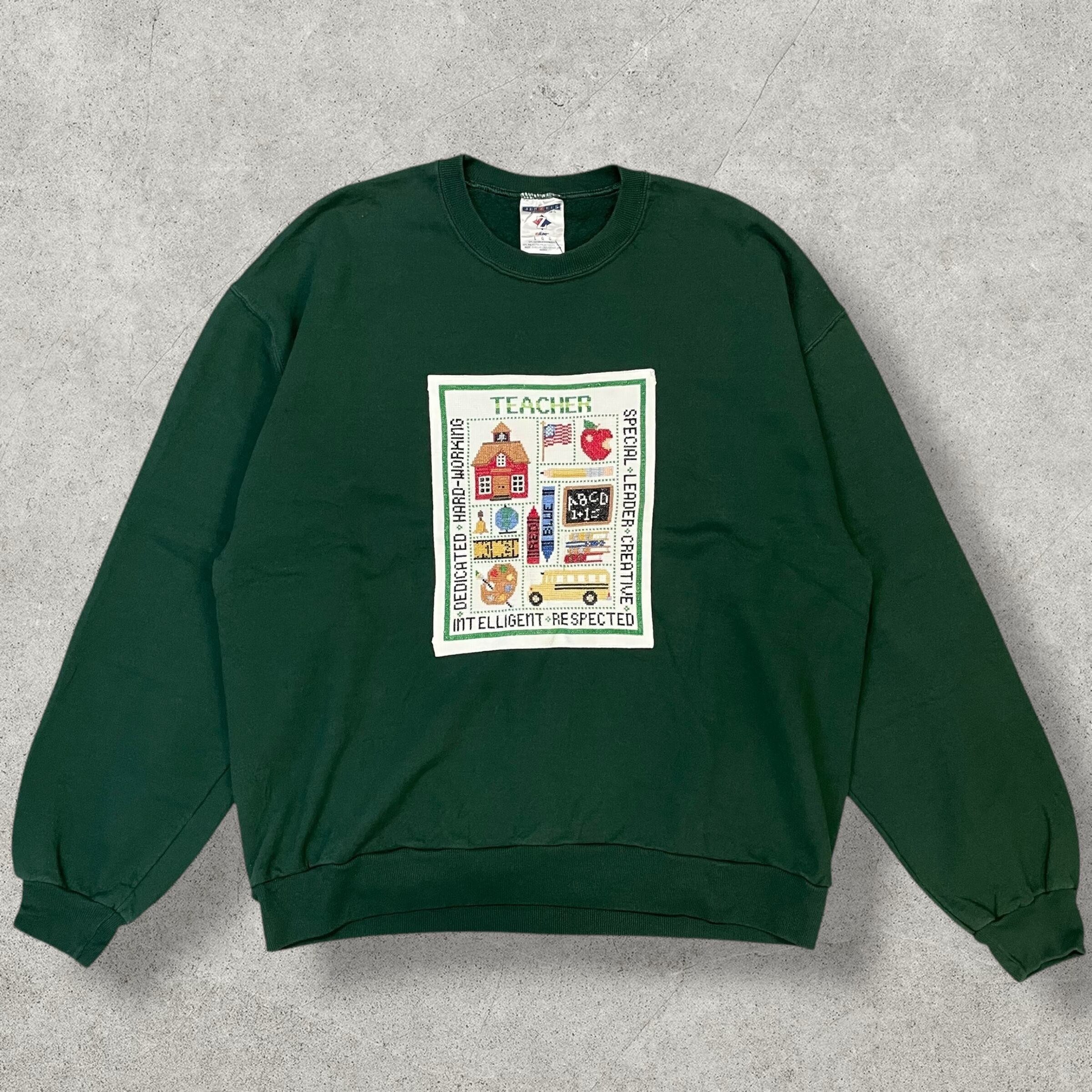 深みのあるグリーンボディに、クロスステッチ風の刺繍プリントが映える個性派スウェット。