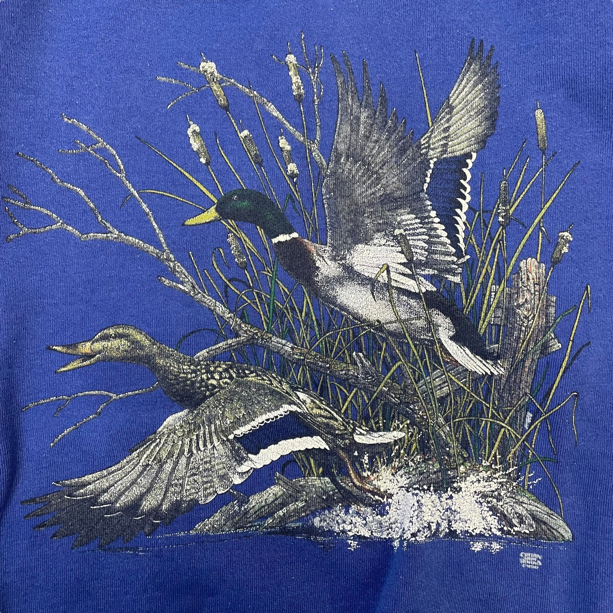 鮮やかなロイヤルブルーのボディに、マガモ(Mallard)が飛び立つ迫力のワイルドライフプリントが映える一着。