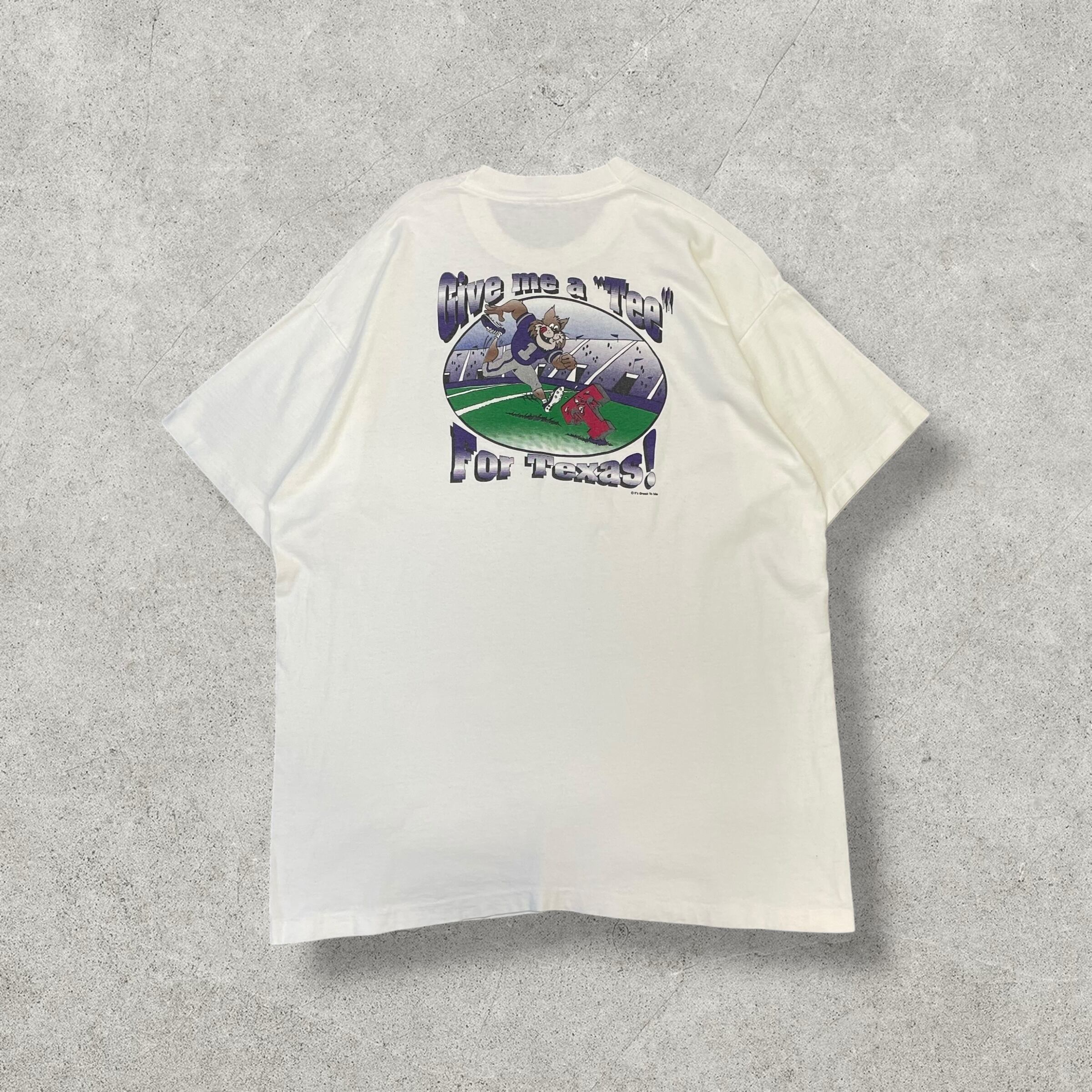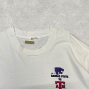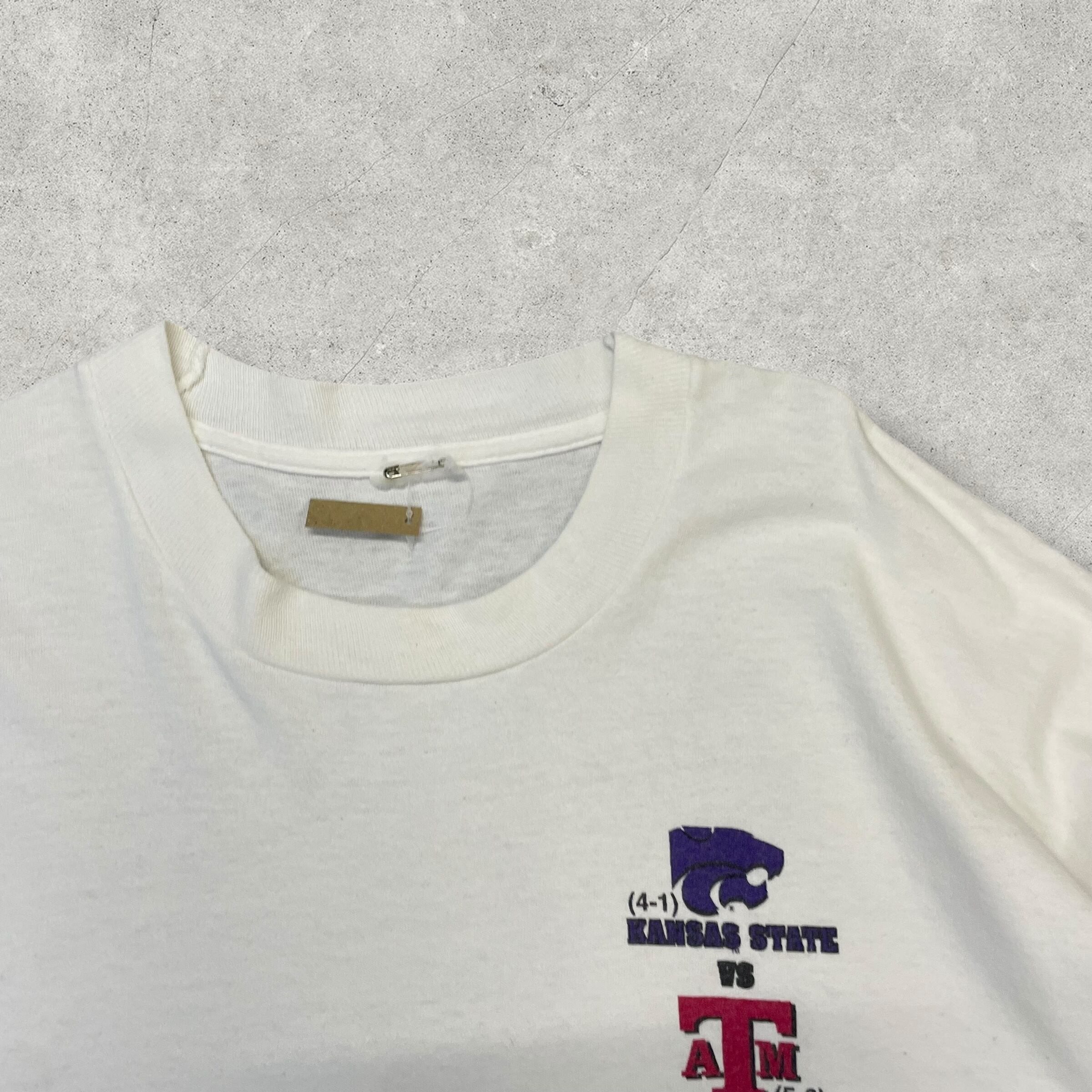アメフトの名門校、Kansas State UniversityとTexas A&Mの対戦を記念したカレッジTシャツ。胸元には両校のロゴとスコア記録、バックには「Give me a ‘Tee’ for Texas!」というジョークの効いたイラスト入りデザイン。