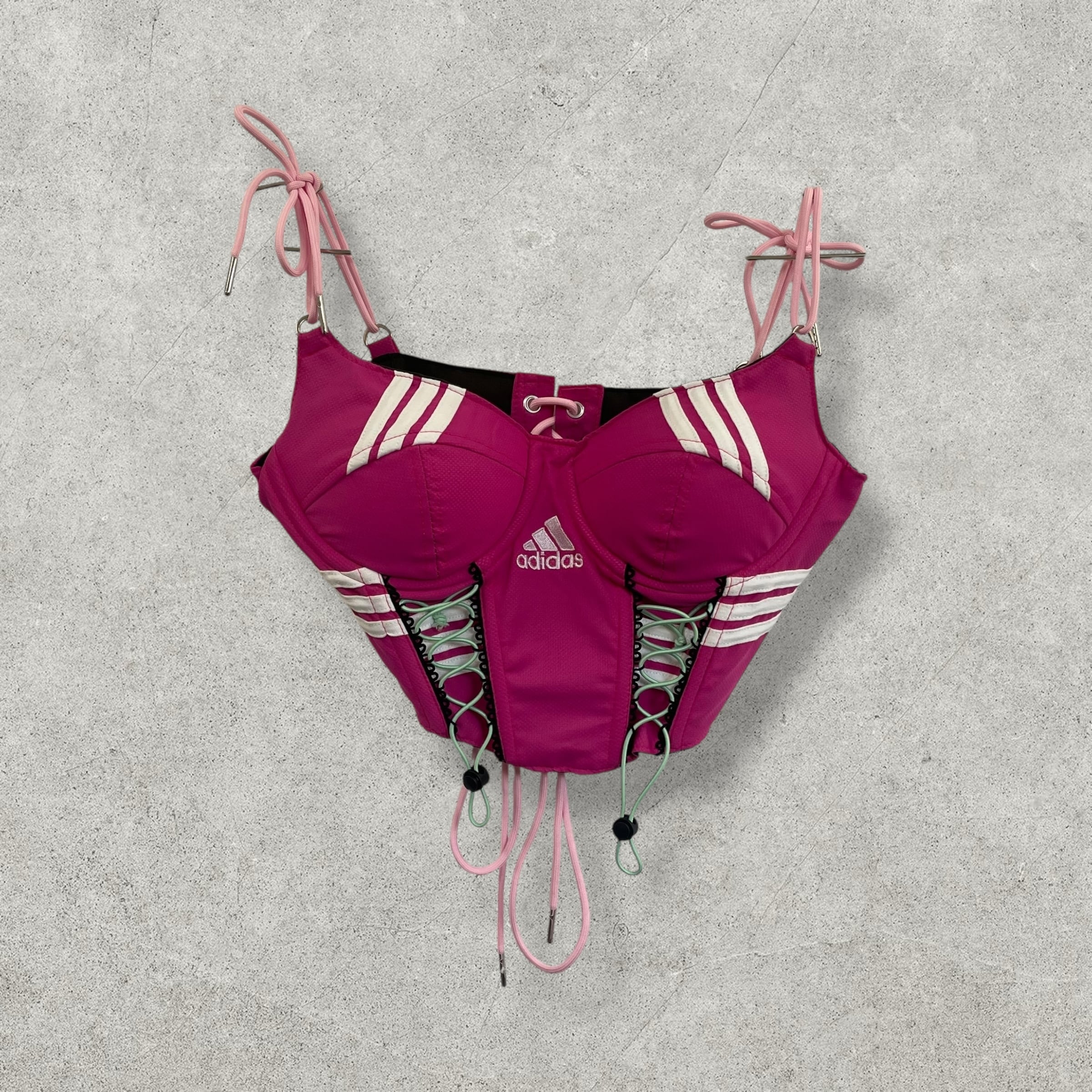 鮮やかなピンクにホワイトの3本ラインが映えるadidasリメイクコルセット。