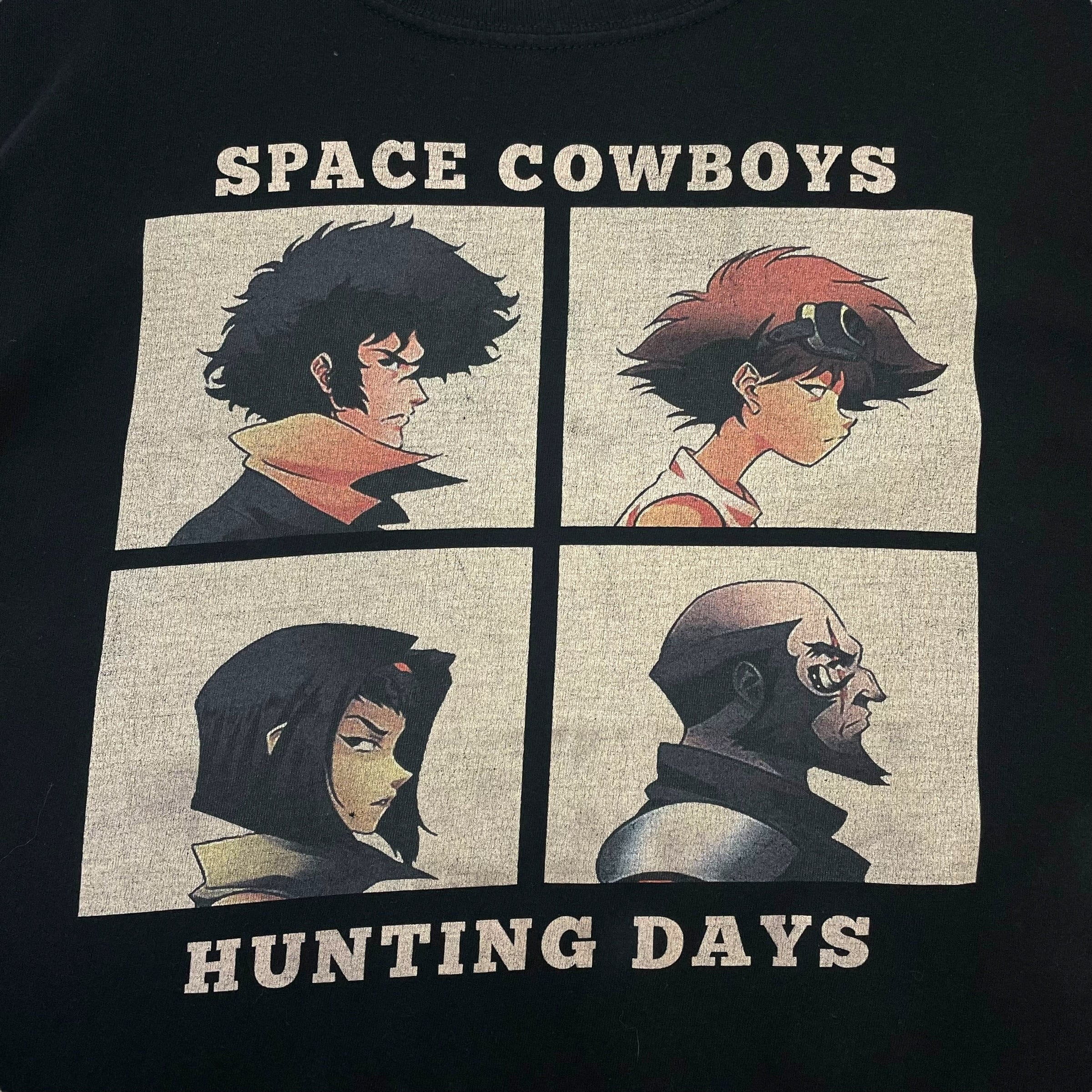 90年代後半〜2000年代にかけて放送された伝説的アニメ『カウボーイビバップ』の主要キャラクター4人が並んだプリントTシャツ。フロントにはスパイク、フェイ、エド、ジェットの横顔アートがレトロな風合いでデザインされ、下部には“SPACE COWBOYS / HUNTING DAYS”のロゴ入り。バックは無地で着回しやすく、アニメファンはもちろんストリートや古着コーデにも馴染む1枚です。