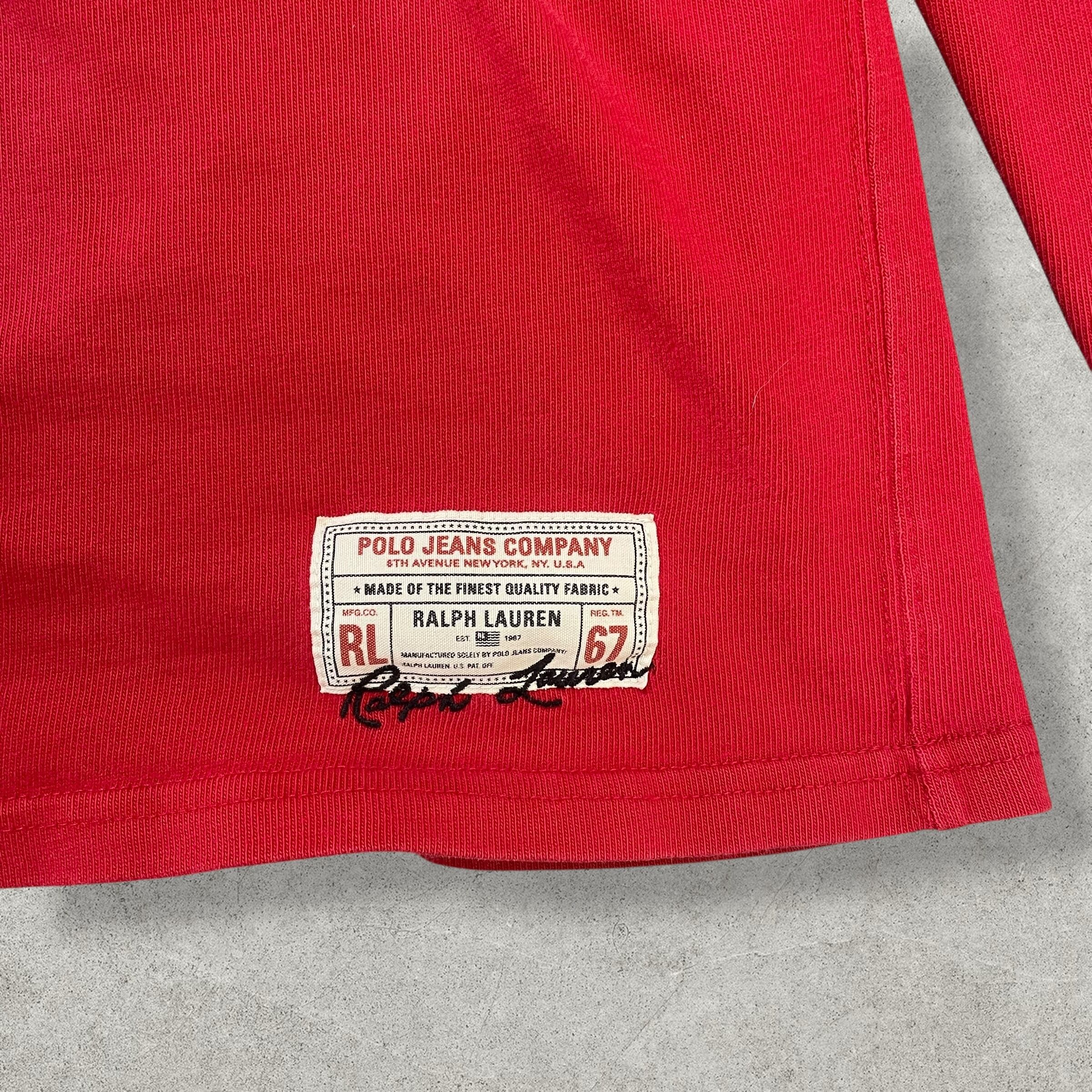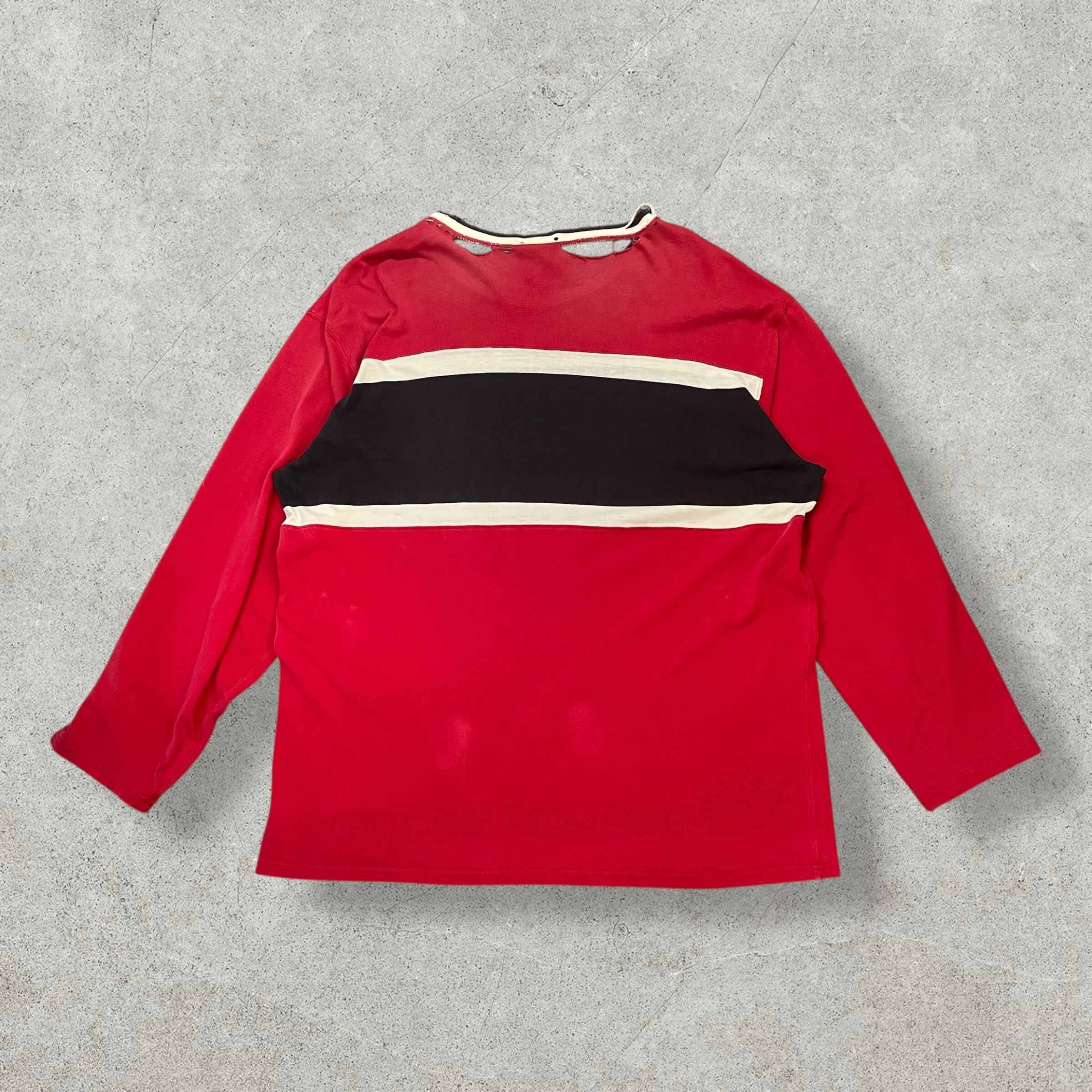 ビビッドなレッド×ブラックの切り替えデザインに「067」ナンバリング入りのロングスリーブTシャツ。ヴィンテージらしいヤレ感や首元・袖のダメージが雰囲気抜群で、古着好きにおすすめの一枚です。