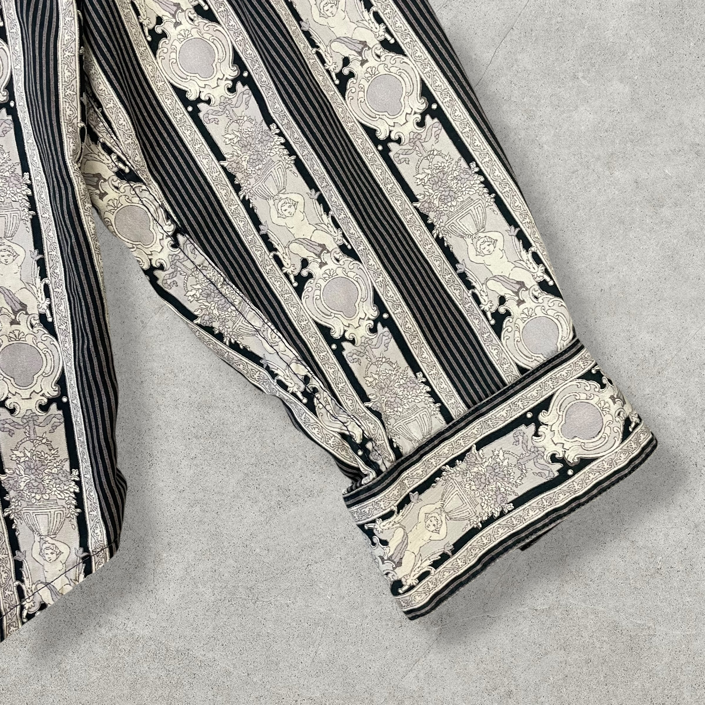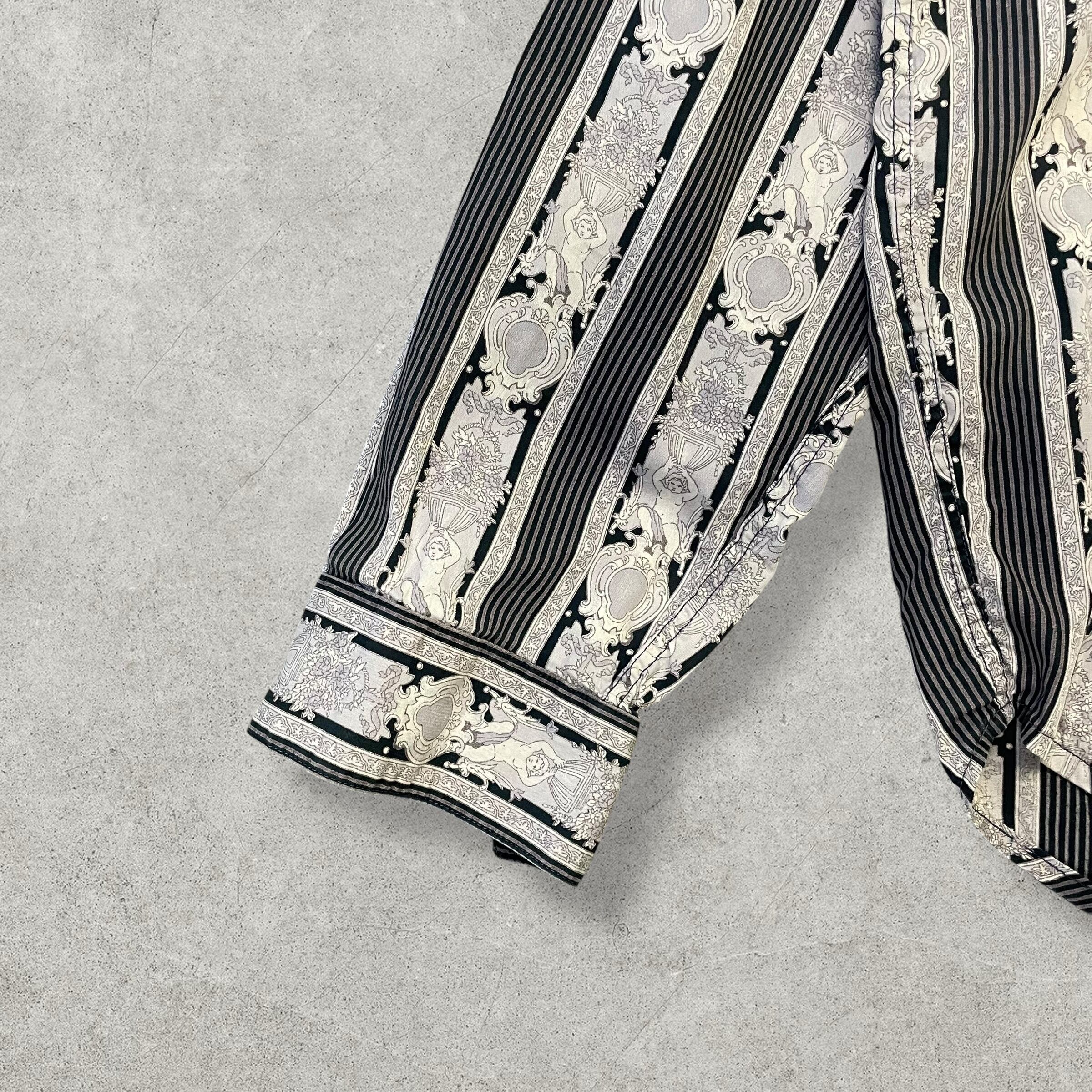イタリア製 Byblos の総柄ストライプシャツ。クラシカルな装飾モチーフとストライプが融合した独特なデザインで、モードにもカジュアルにも落とし込める一着。上品かつ存在感あるスタイルを演出可能です。