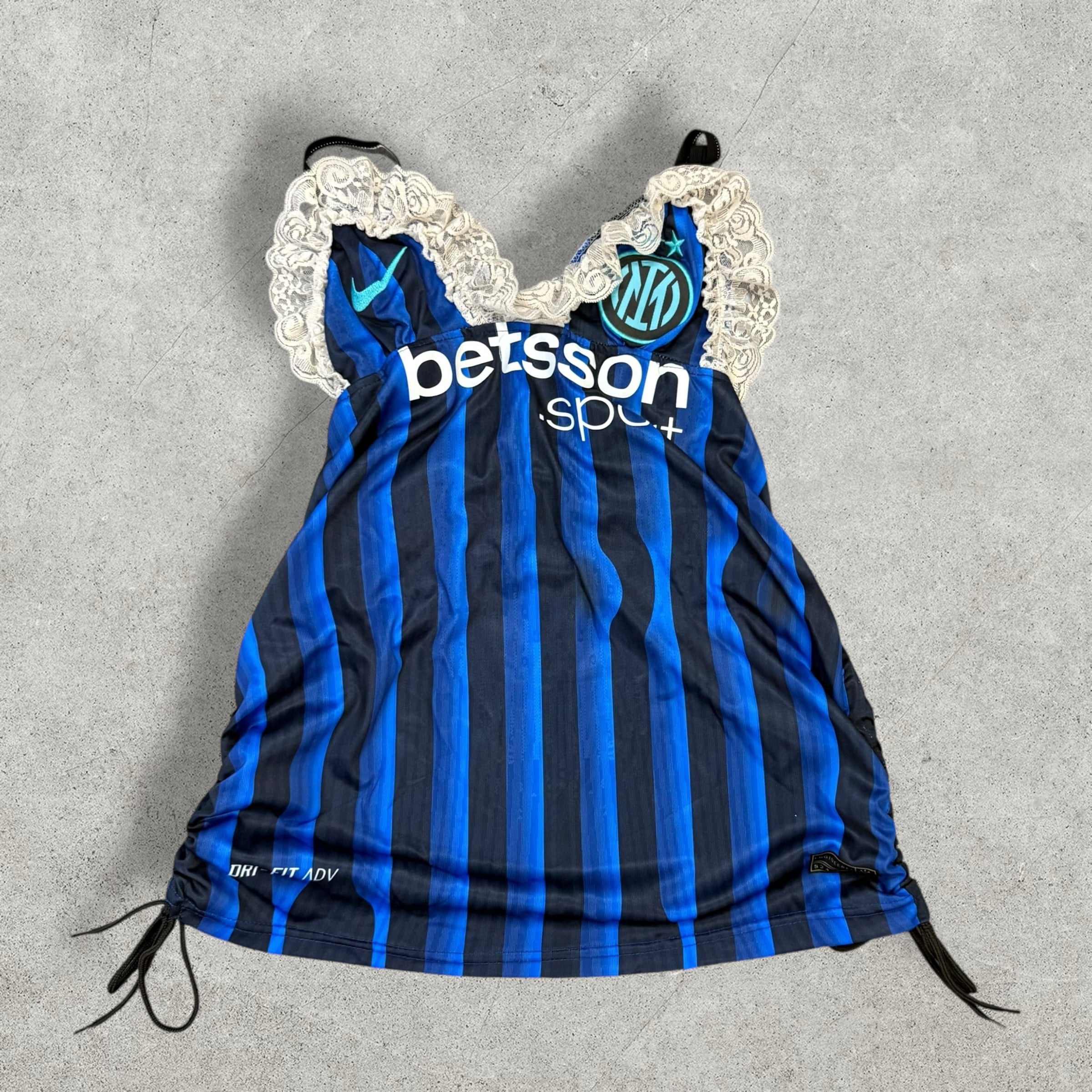 チームのアイコニックなブルー×ブラックのストライプを活かし、胸元にレースをプラス