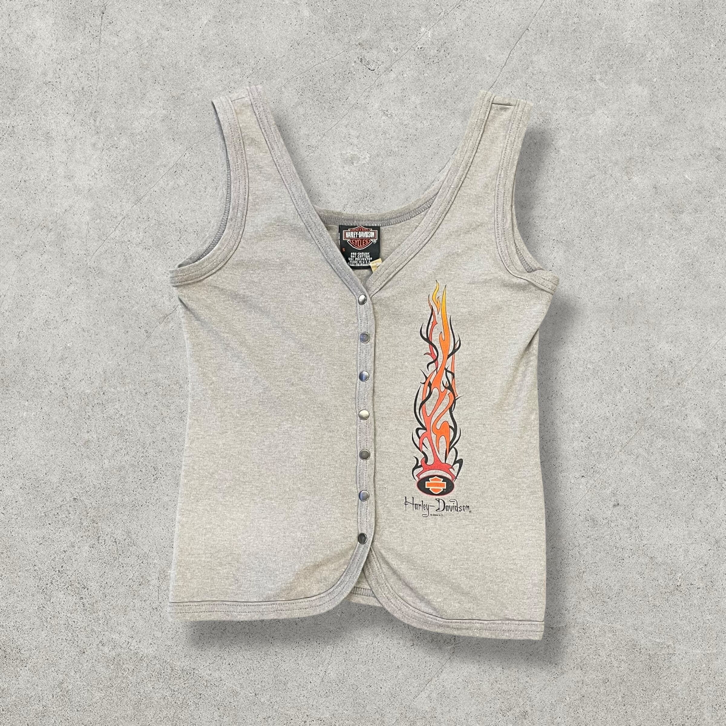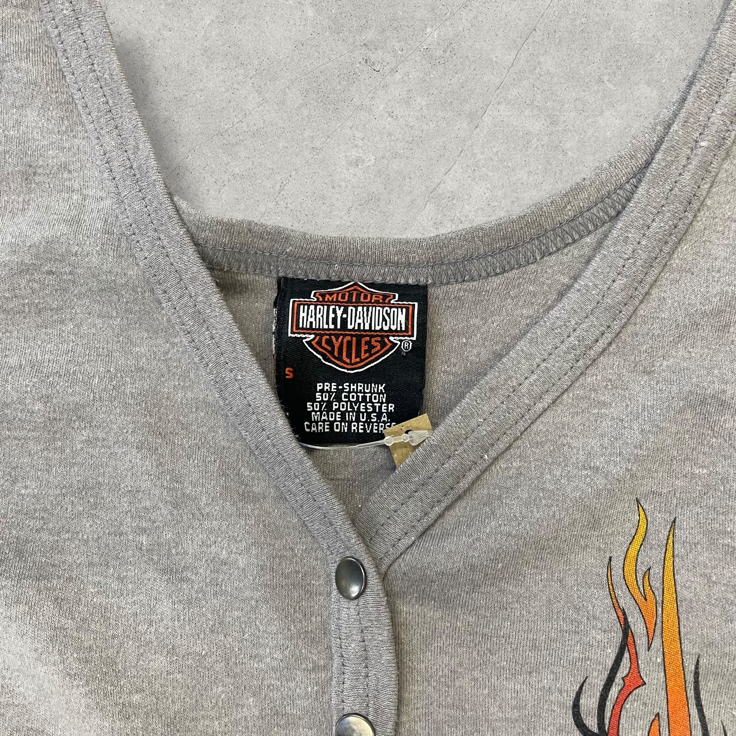 グレーのボディにフロントは炎のフレイム&Harley-Davidsonロゴ、背面は”INDIANAPOLIS SOUTH SIDE H-D” のプリント入り。スナップボタン仕様のデザインで、バイクカルチャーらしい存在感のある一枚。アメカジスタイルや古着コーデにピッタリです。
