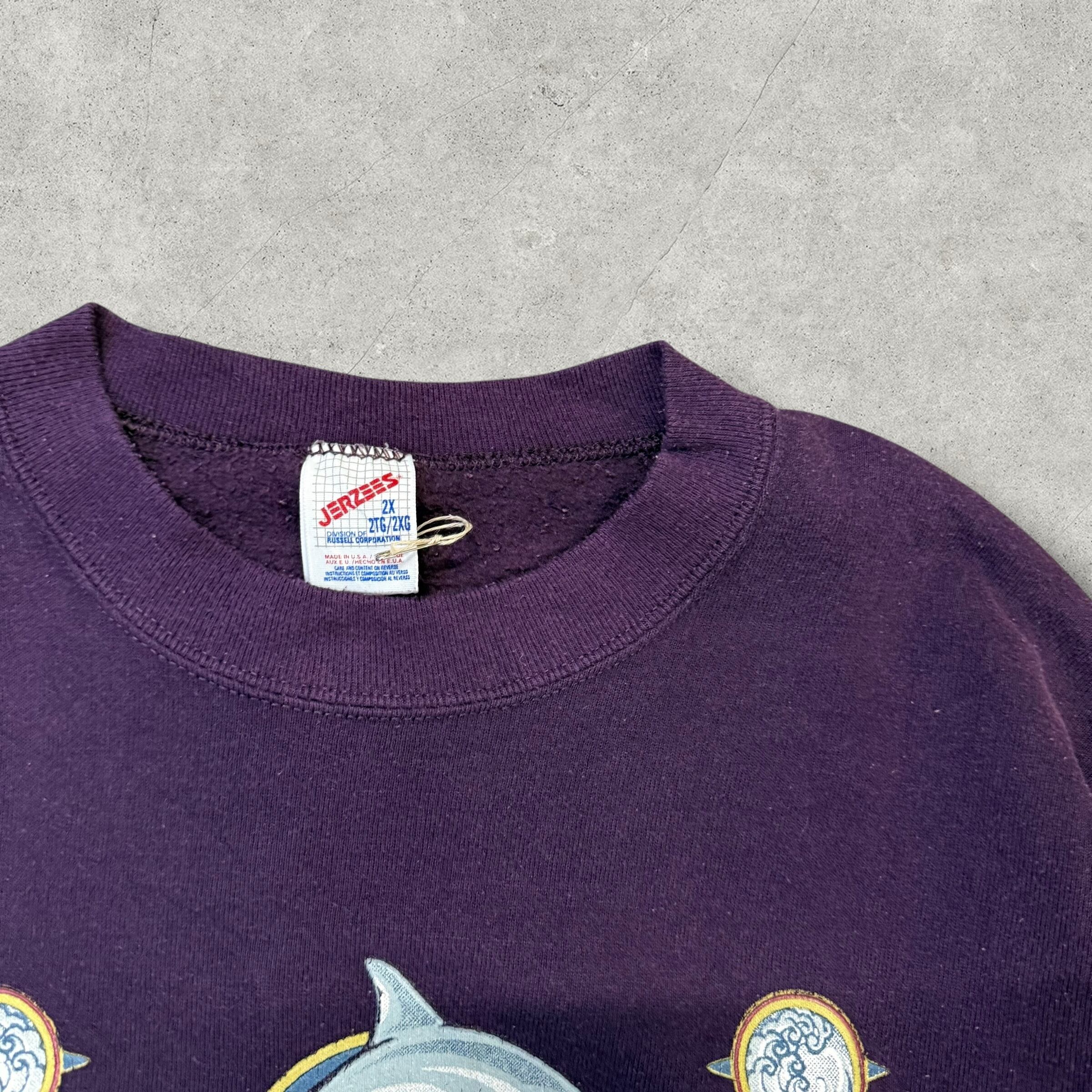 深みのあるパープルボディに大きなドルフィングラフィックが映えるデザイン。USA製Jerzeesボディで肉厚感のある生地。旅行土産らしいキャッチーな雰囲気と、古着ならではの一点物感を楽しめるアイテムです。