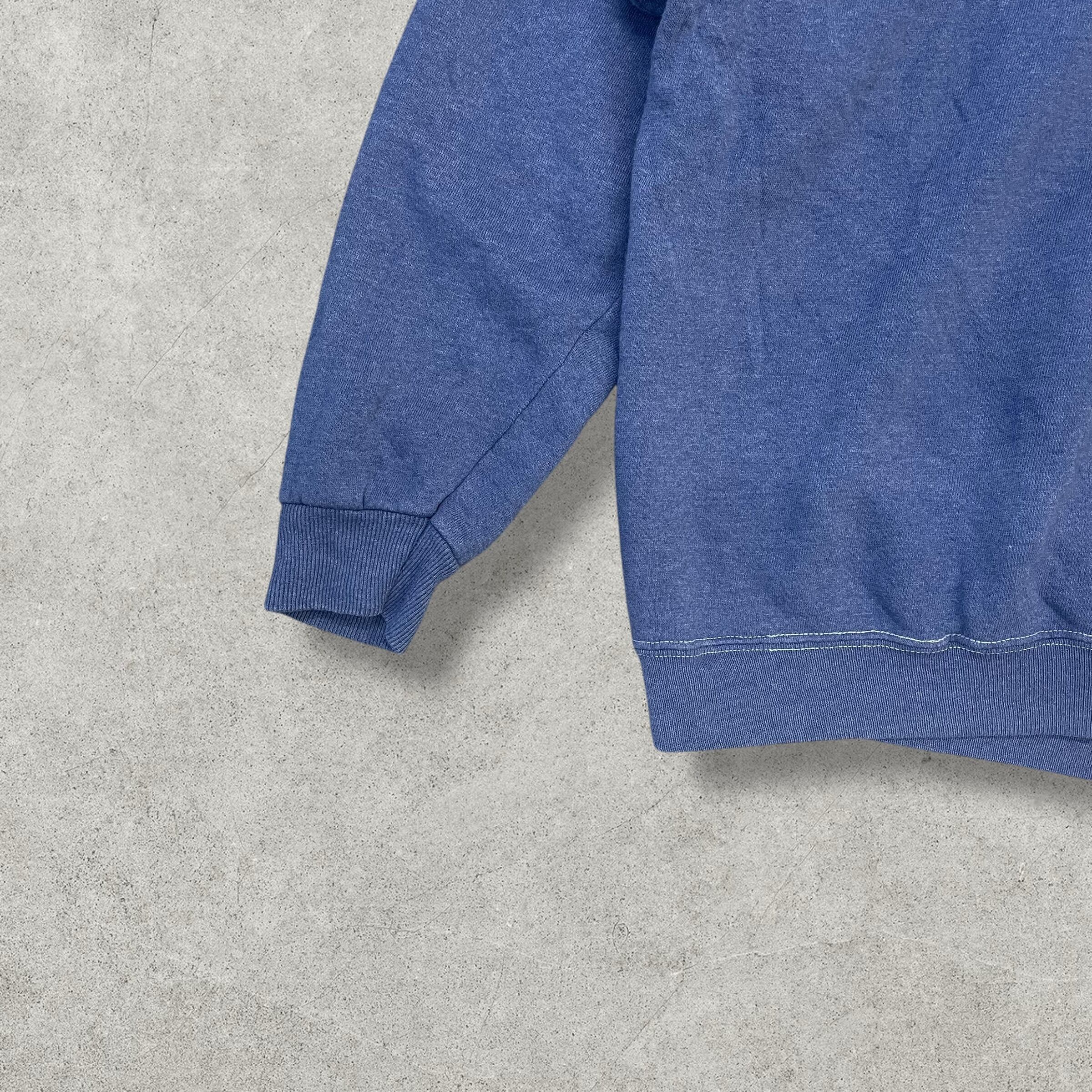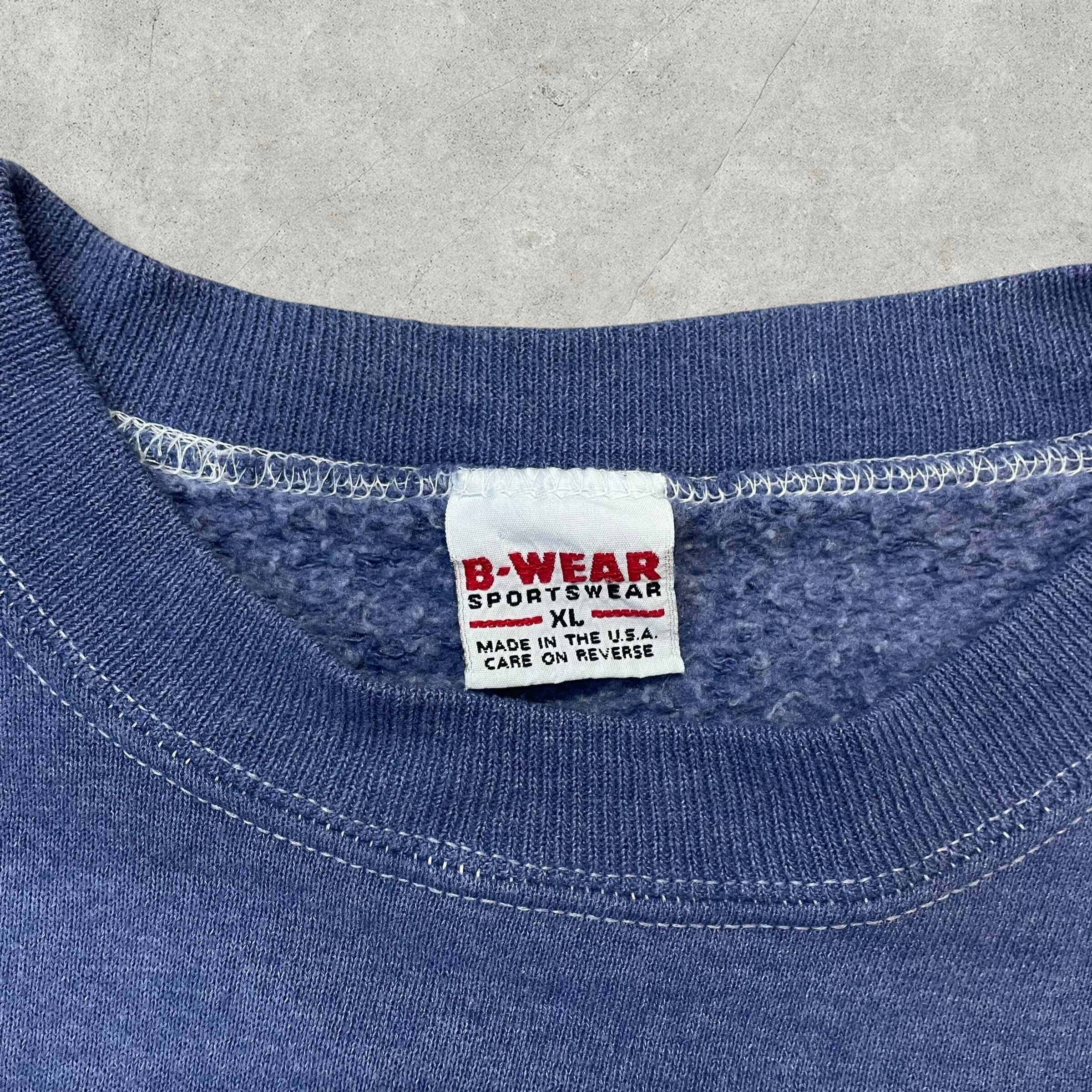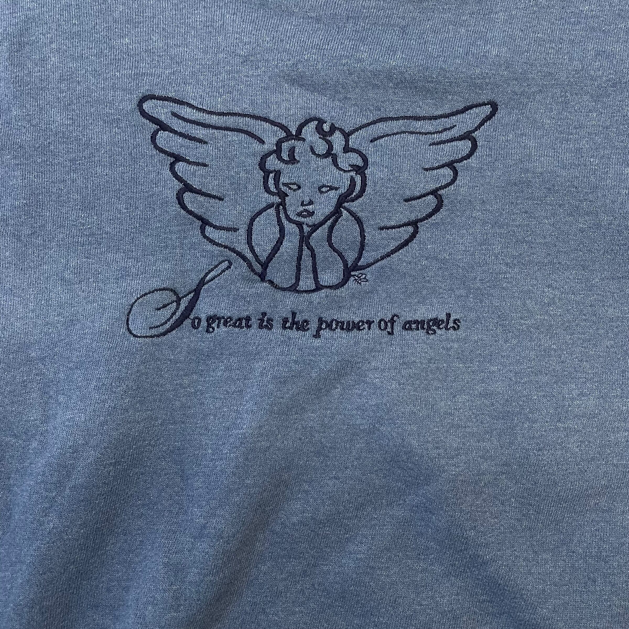90年代B-WEAR製のエンジェルグラフィックスウェット。胸元に天使と「So great is the power of angels」の文字がプリントされており、霜降りブルーのボディが雰囲気抜群。オーバーサイズなXL表記でユニセックスにおすすめの一着です。