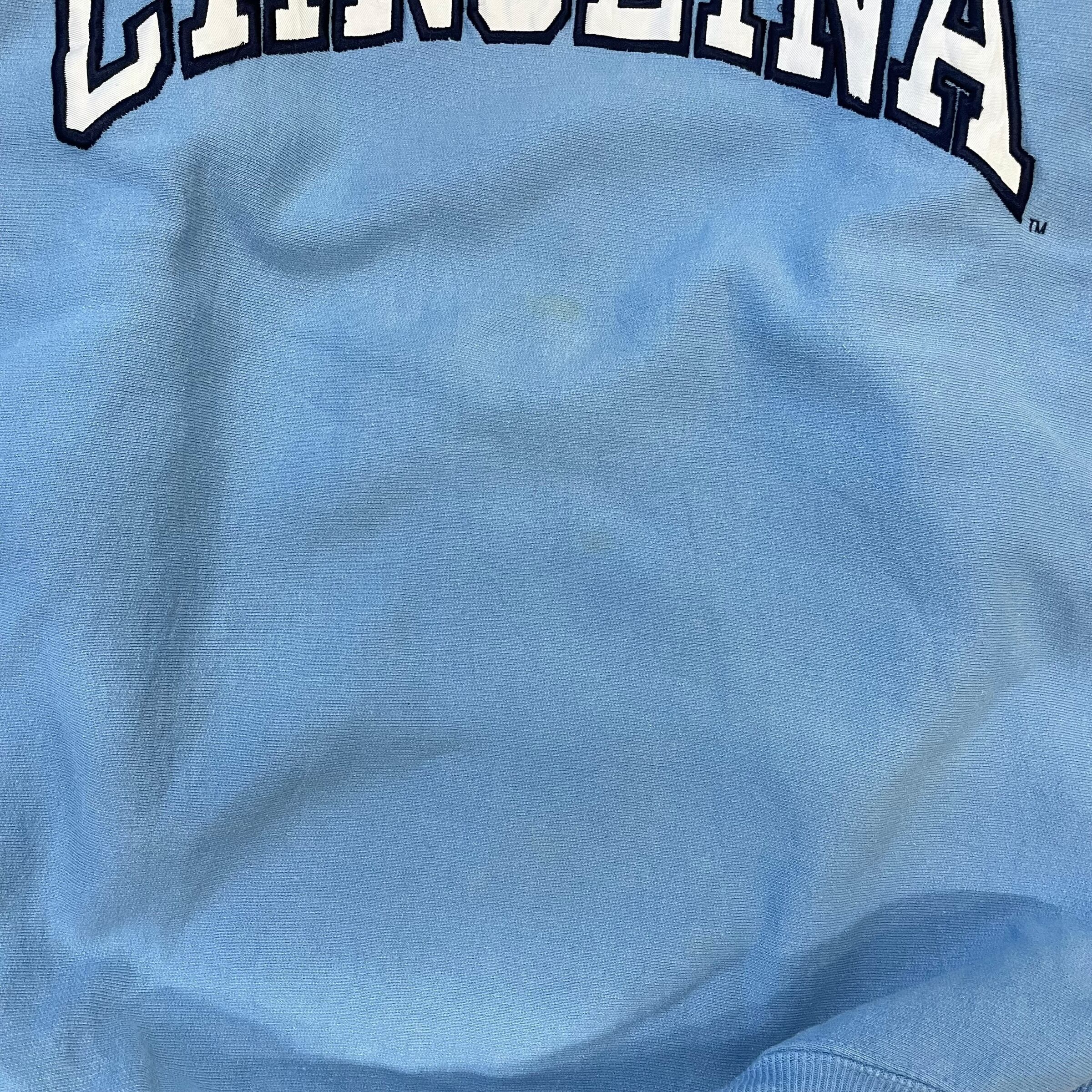 ライトブルーのボディに「CAROLINA」ロゴが映えるカレッジスウェット。シンプルなアーチロゴデザインで、ストリートにもカジュアルにも合わせやすい1枚です。全体的に使用感や色褪せ、薄いシミがありますが、古着ならではの風合いとして着こなせるアイテム。裏起毛で着心地も良く、インナーとしても活躍します。