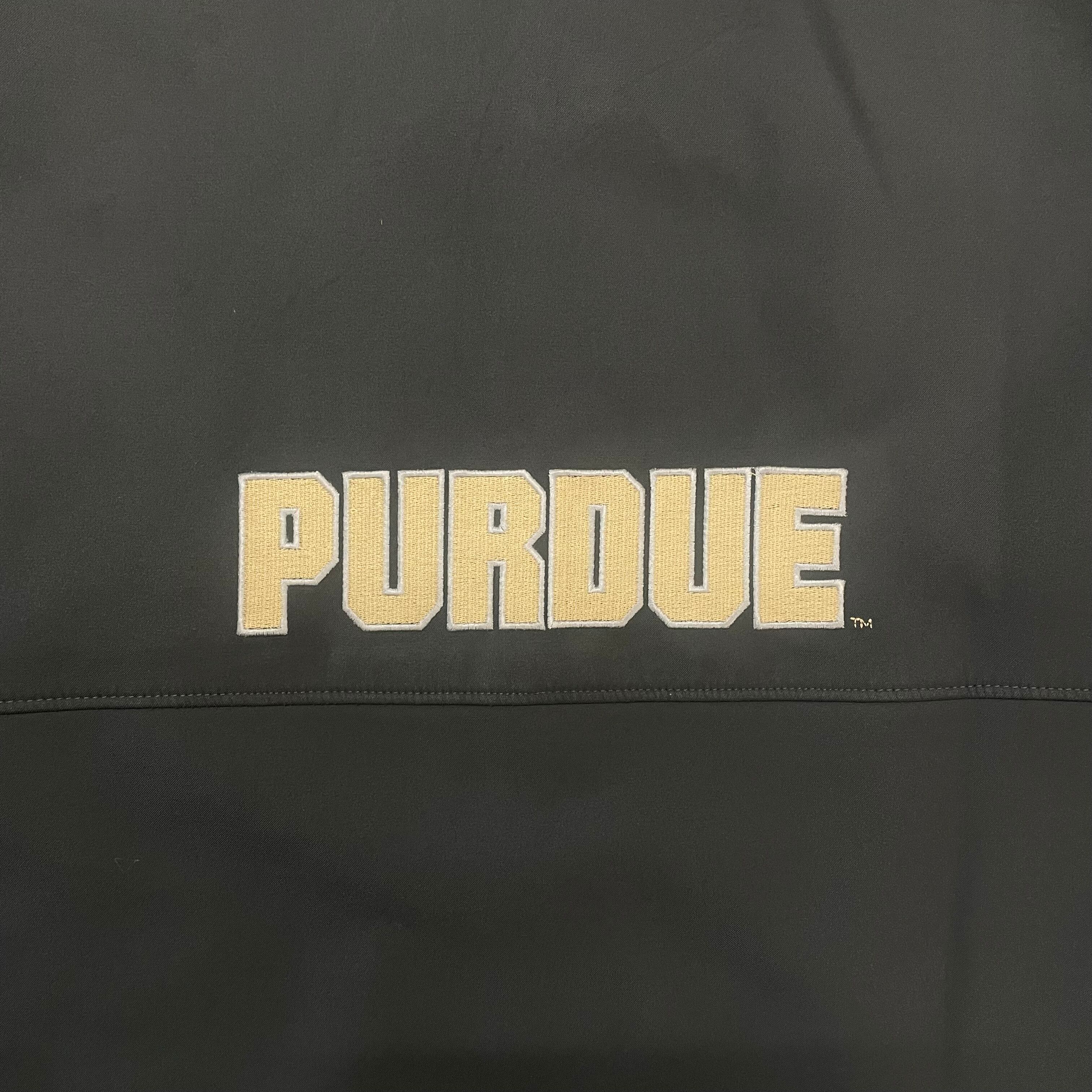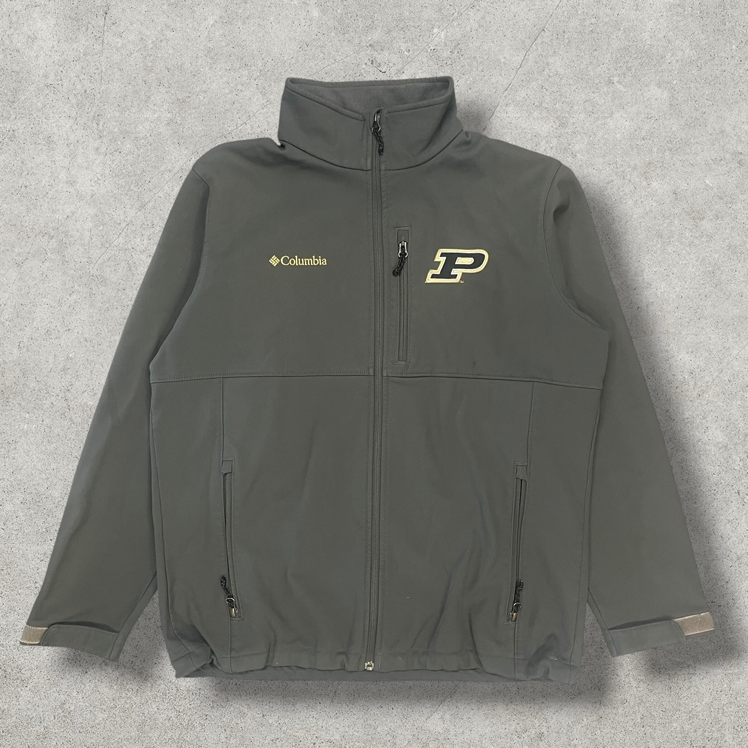 Columbia製ソフトシェルジャケット。胸元にはブランドロゴとPURDUE大学のロゴ刺繍入り、背面には大きくPURDUEの文字が入った存在感ある一枚。撥水性のある生地でアウトドアやタウンユースにも最適。