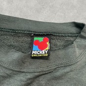 90’s Mickey Unlimitedシリーズの覗きミッキースウェット。ポケットからひょっこり顔を出すミッキーが愛らしいデザインで、刺繍風の立体プリントが特徴的。深いフォレストグリーンのボディが落ち着いた印象を与えつつ、どこかレトロでポップな存在感を放つ一着です。アメリカ・Jerry Leigh社製で、当時の雰囲気をしっかり感じられるヴィンテージアイテム。