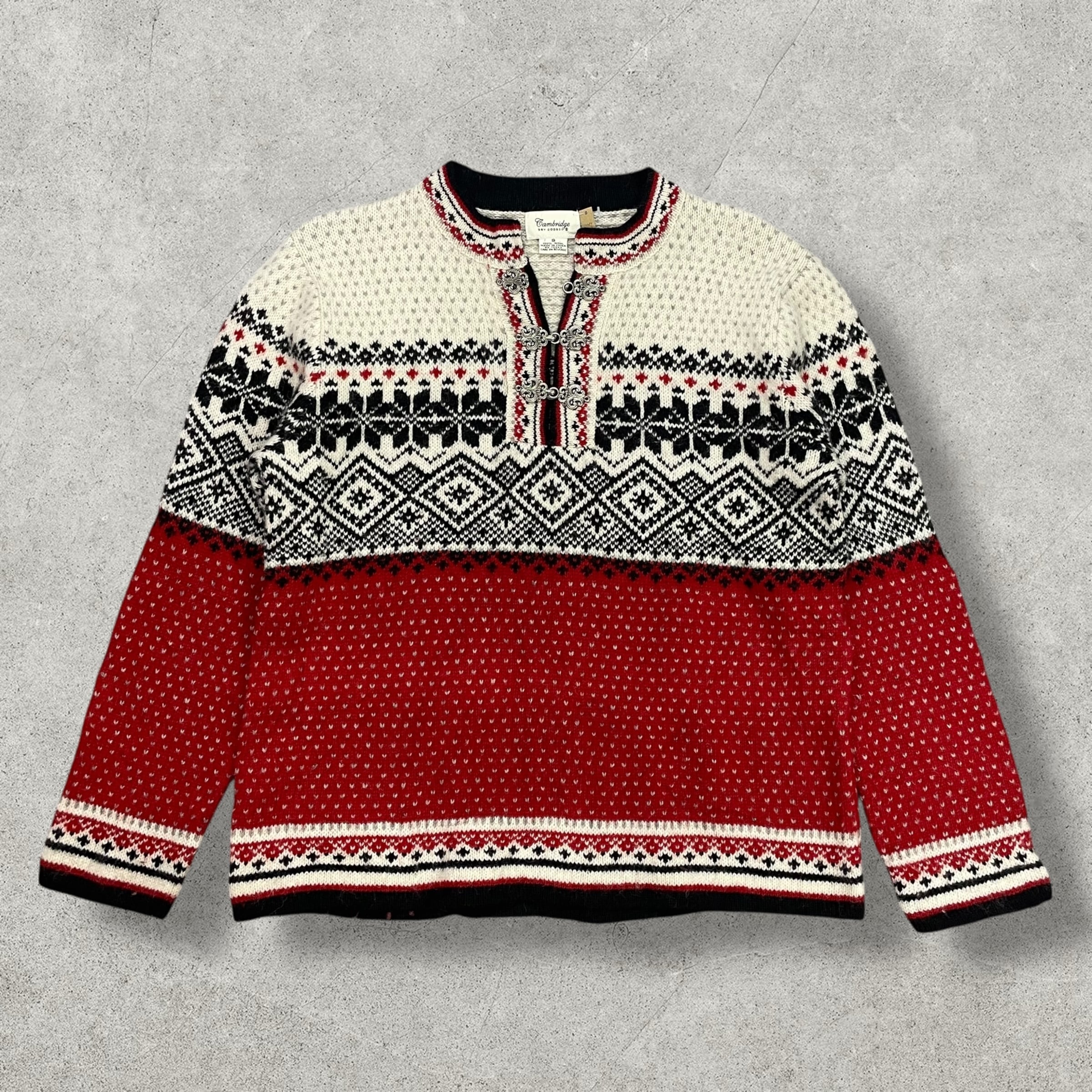 赤×オフホワイト×ブラックの3色構成が印象的なノルディックセーター。フロントにはトラディショナルな金具フックが施され、クラシックな雰囲気を演出。上部のフックが1つ欠損していますが、着用に大きな支障はありません。肉厚な100%ウールで暖かく、冬のメインアイテムとして映える1着。