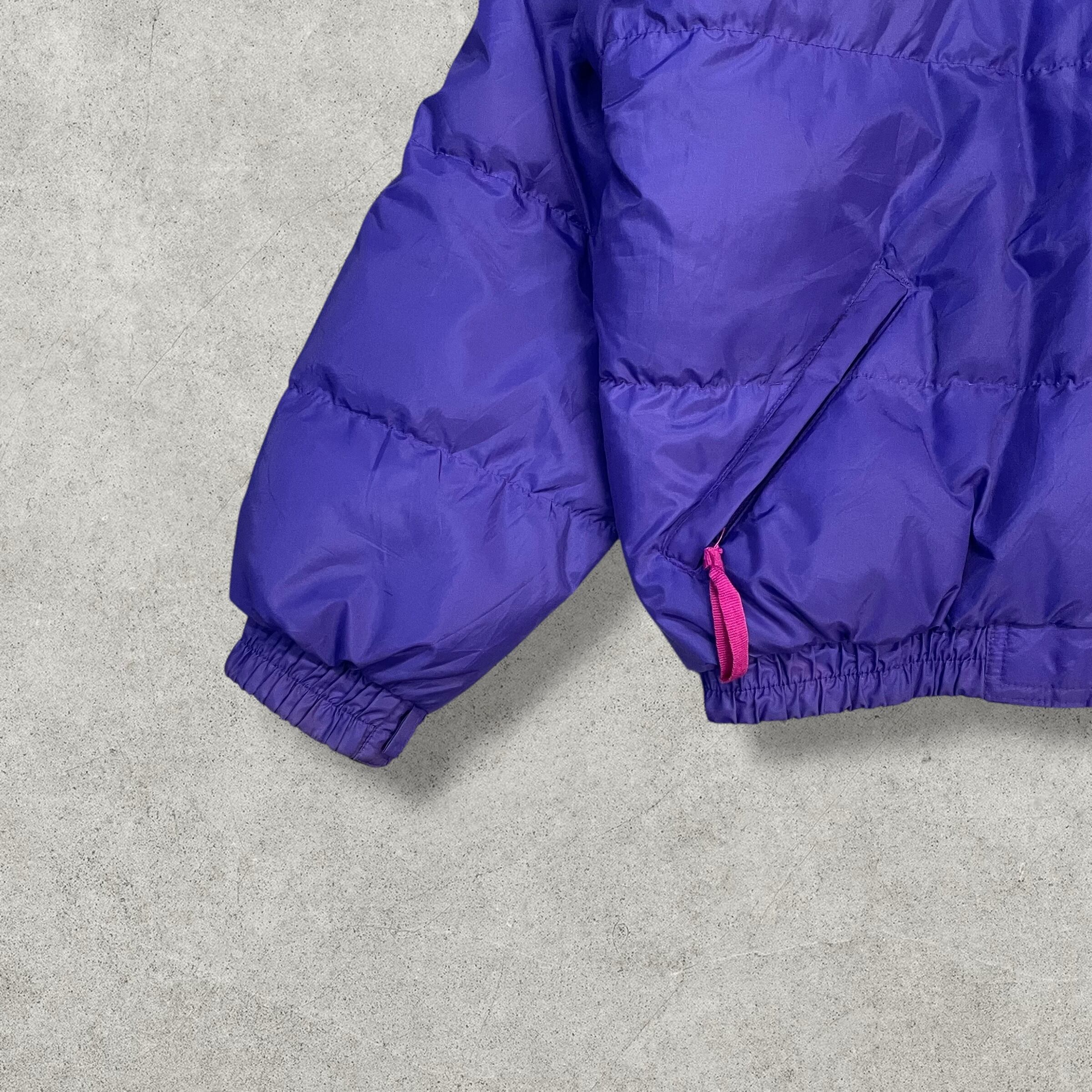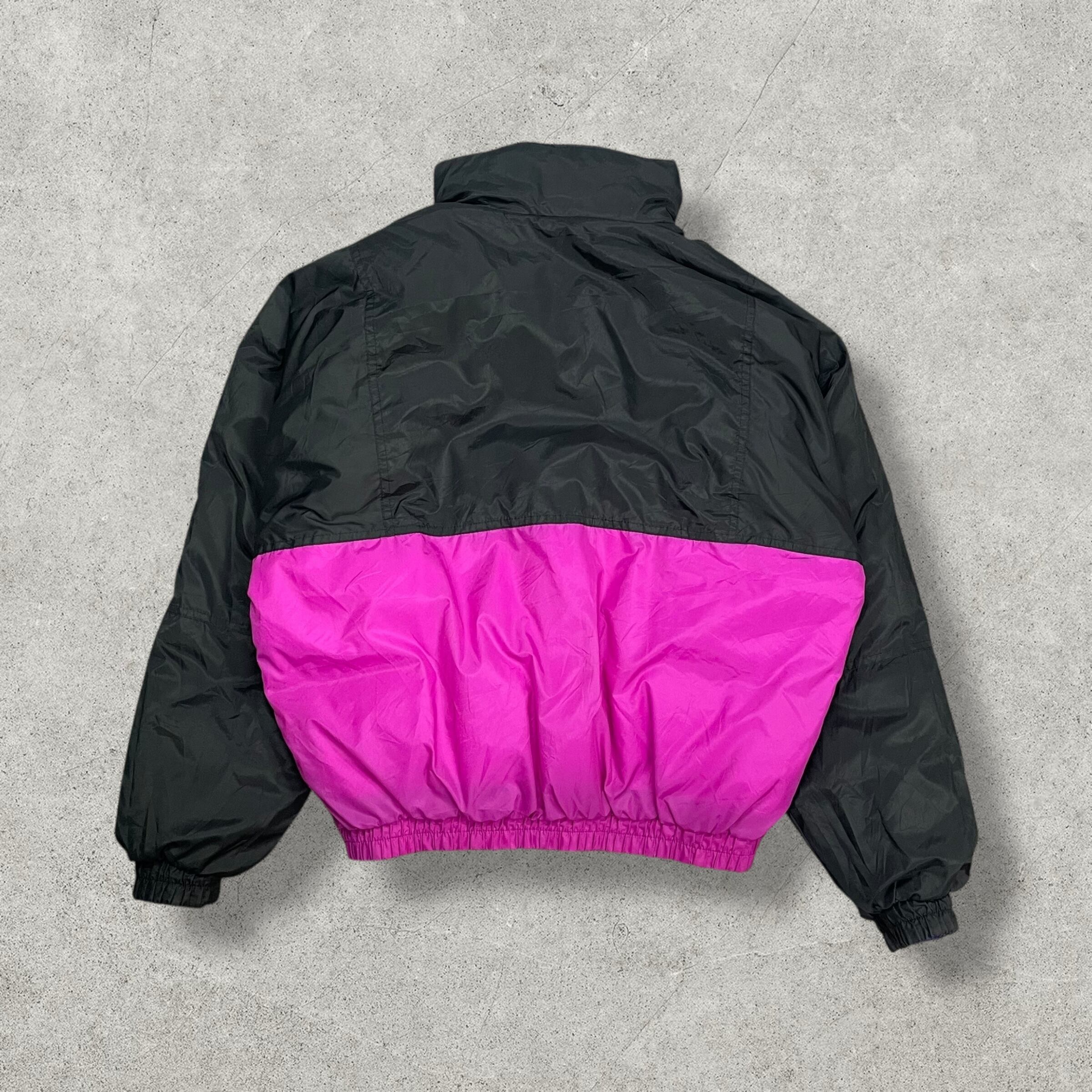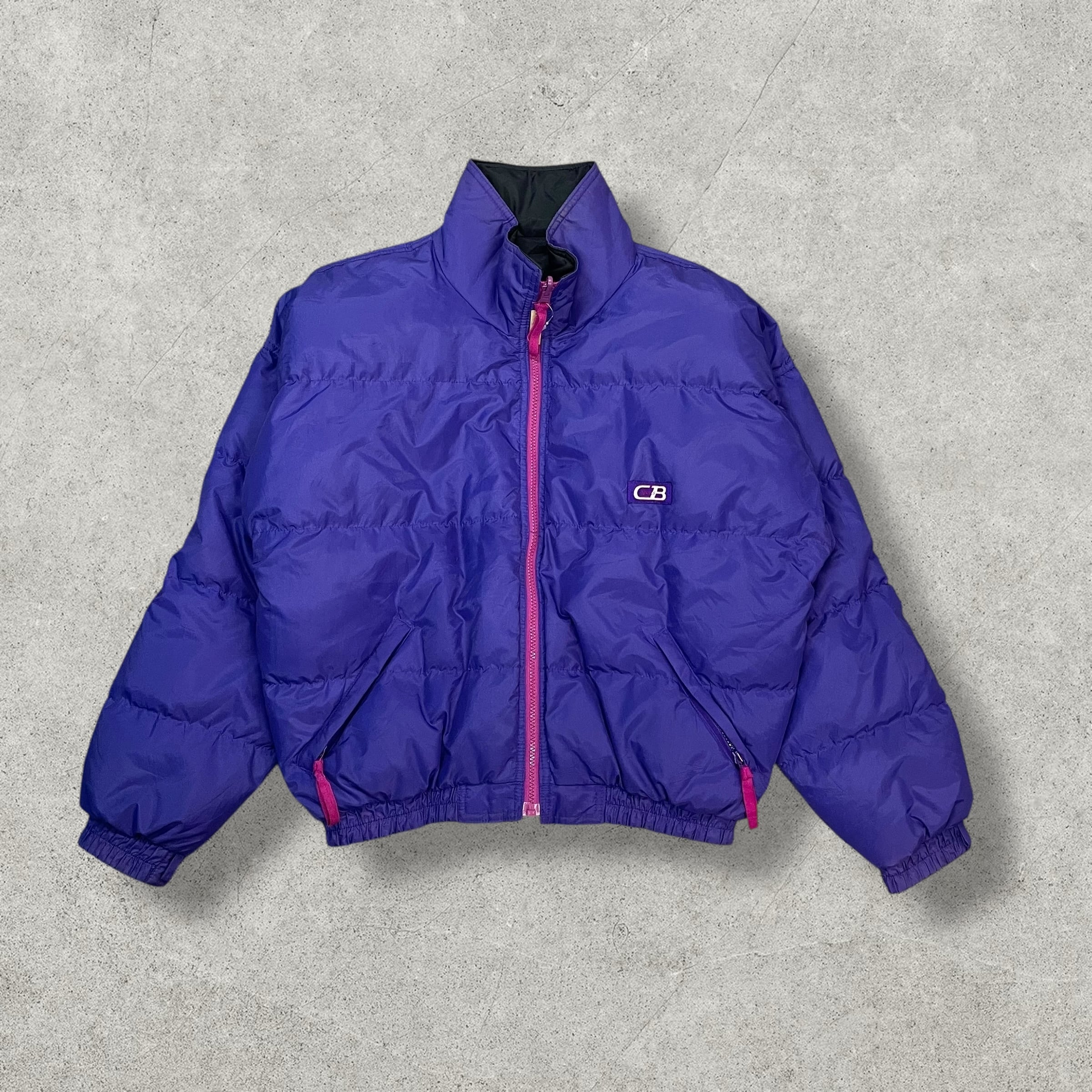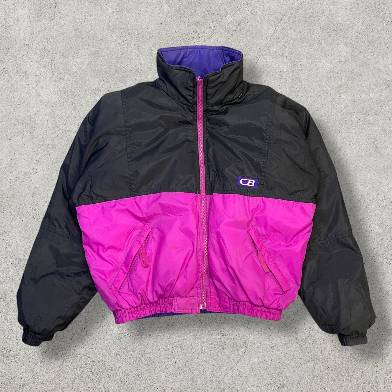 90’sらしいビビッドな配色が目を引くCB SPORTSのリバーシブルナイロンジャケット。片面はパープル×ピンクのカラーブロック、もう片面はパープル単色のシンプル仕様で、気分やスタイリングに合わせて着回しが可能。軽量ながらしっかりとした中綿入りで、冬のストリートスタイルにぴったりな一着です。袖口・裾のゴム仕様でシルエットにも程よいボリューム感があり、男女問わず着用可能。