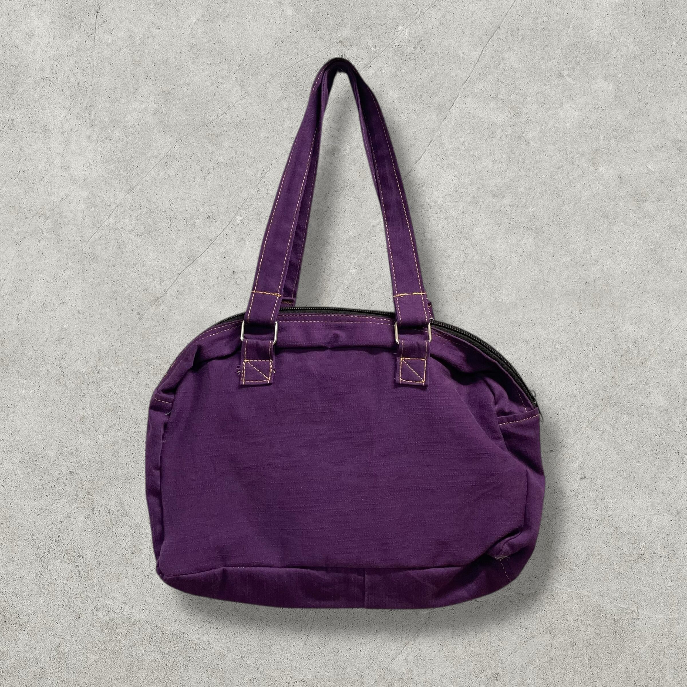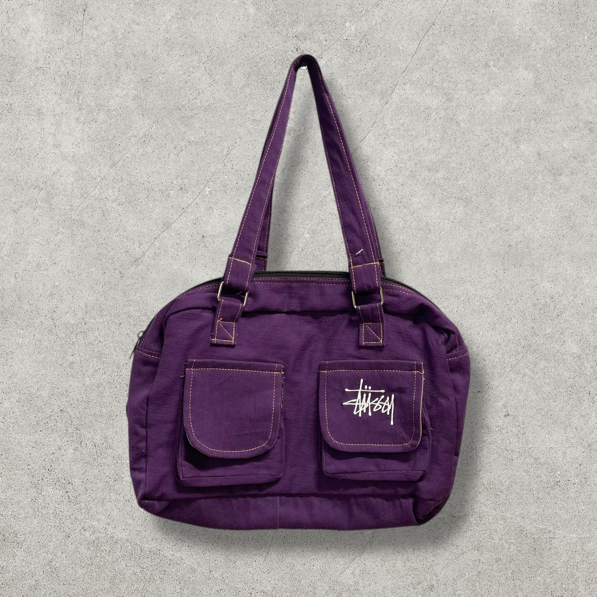 STUSSYのダブルポケットデザインが特徴的なショルダートートバッグ。深みのあるパープルカラーがストリートスタイルに映える一点。しっかりしたナイロン生地で、程よい光沢感とタフな質感が魅力。フロントのロゴ刺繍がポイントで、収納力も高くデイリーユースに最適。