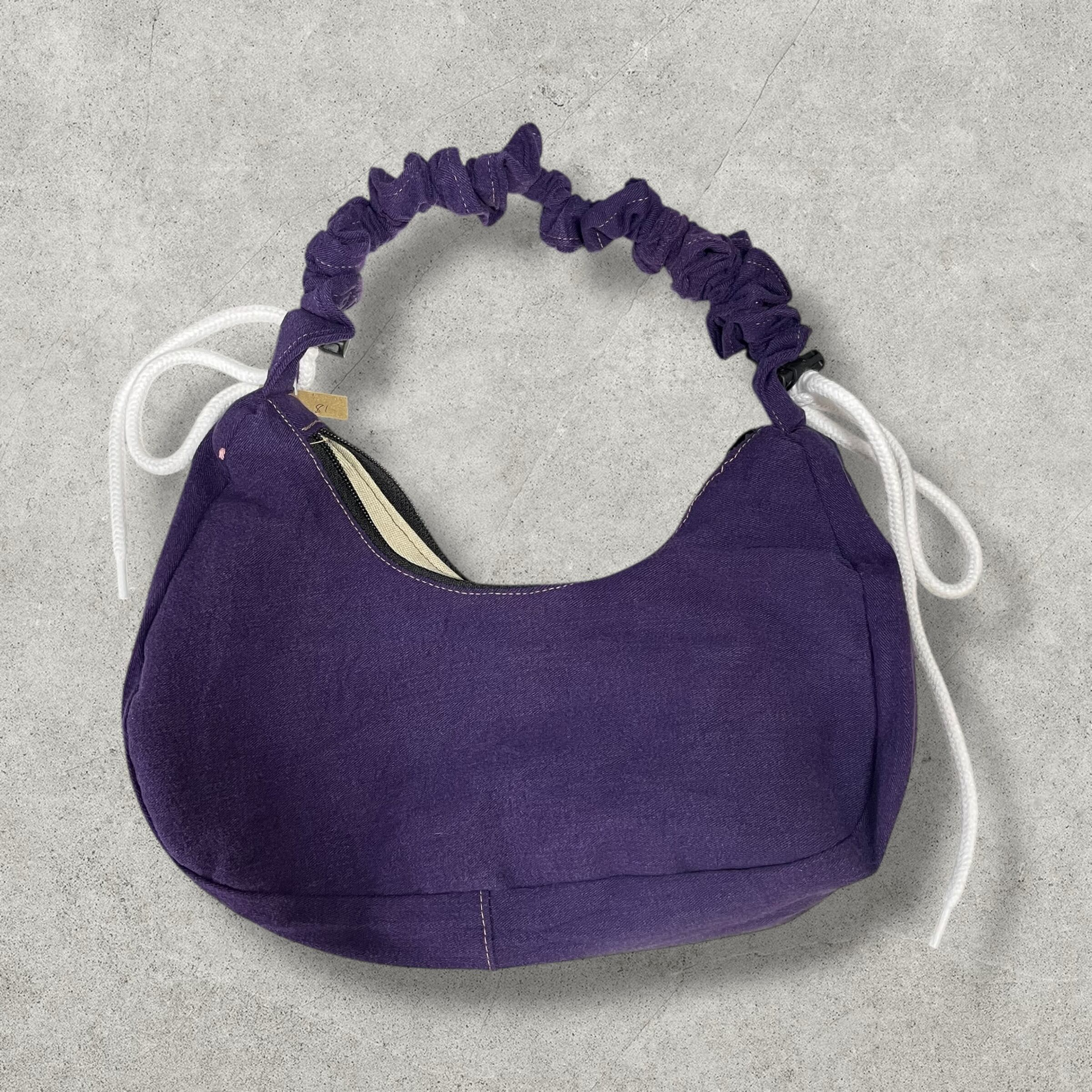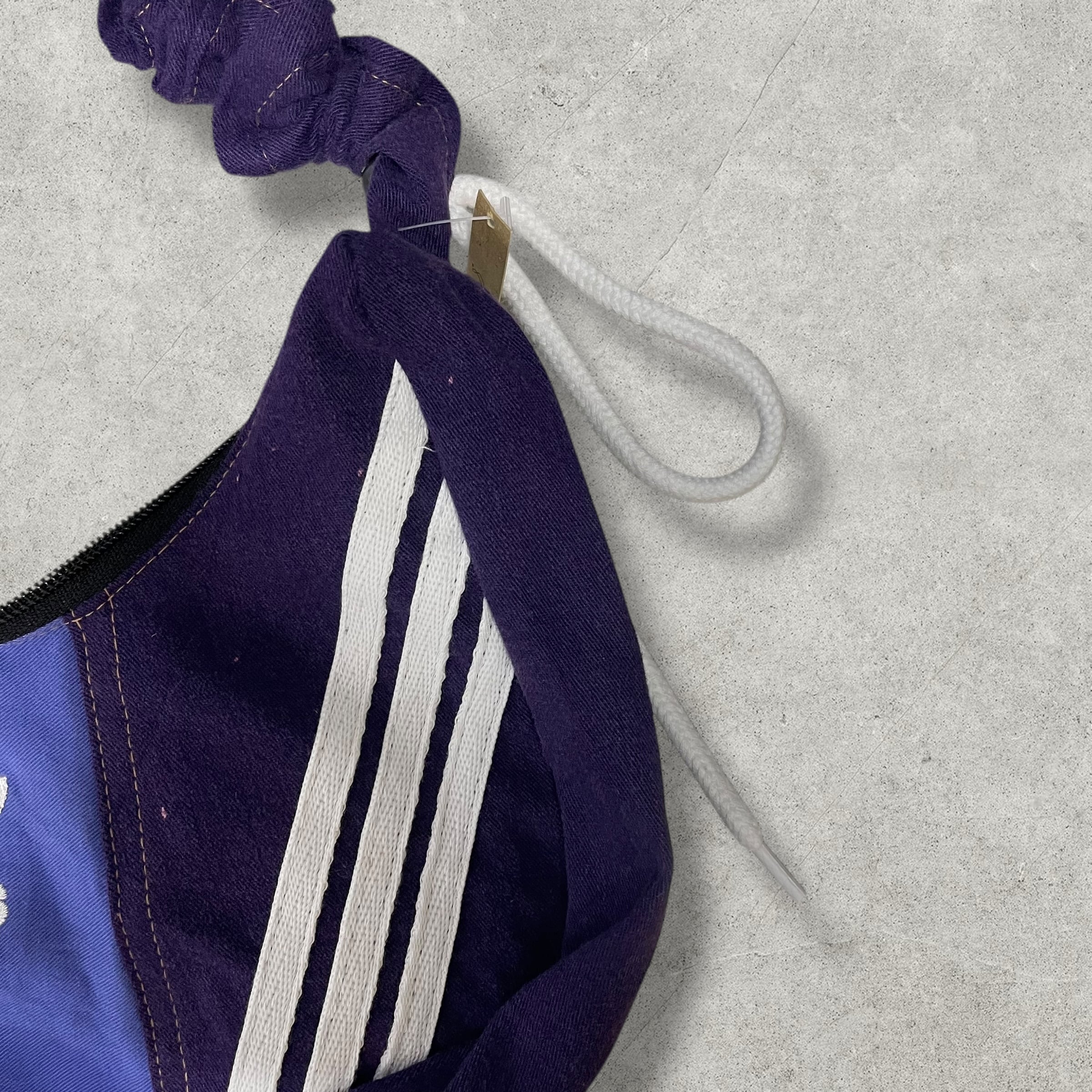 adidasトレフォイルロゴが入ったショルダーバッグ。深みのあるパープルとブルーの切り替えカラーが印象的な一点。ギャザー仕様のショルダーハンドルがデザイン性を高め、コーデのアクセントとしても活躍。小ぶりながらもマチ付きで、財布やスマホなどの必需品がしっかり入る実用的なサイズ感。