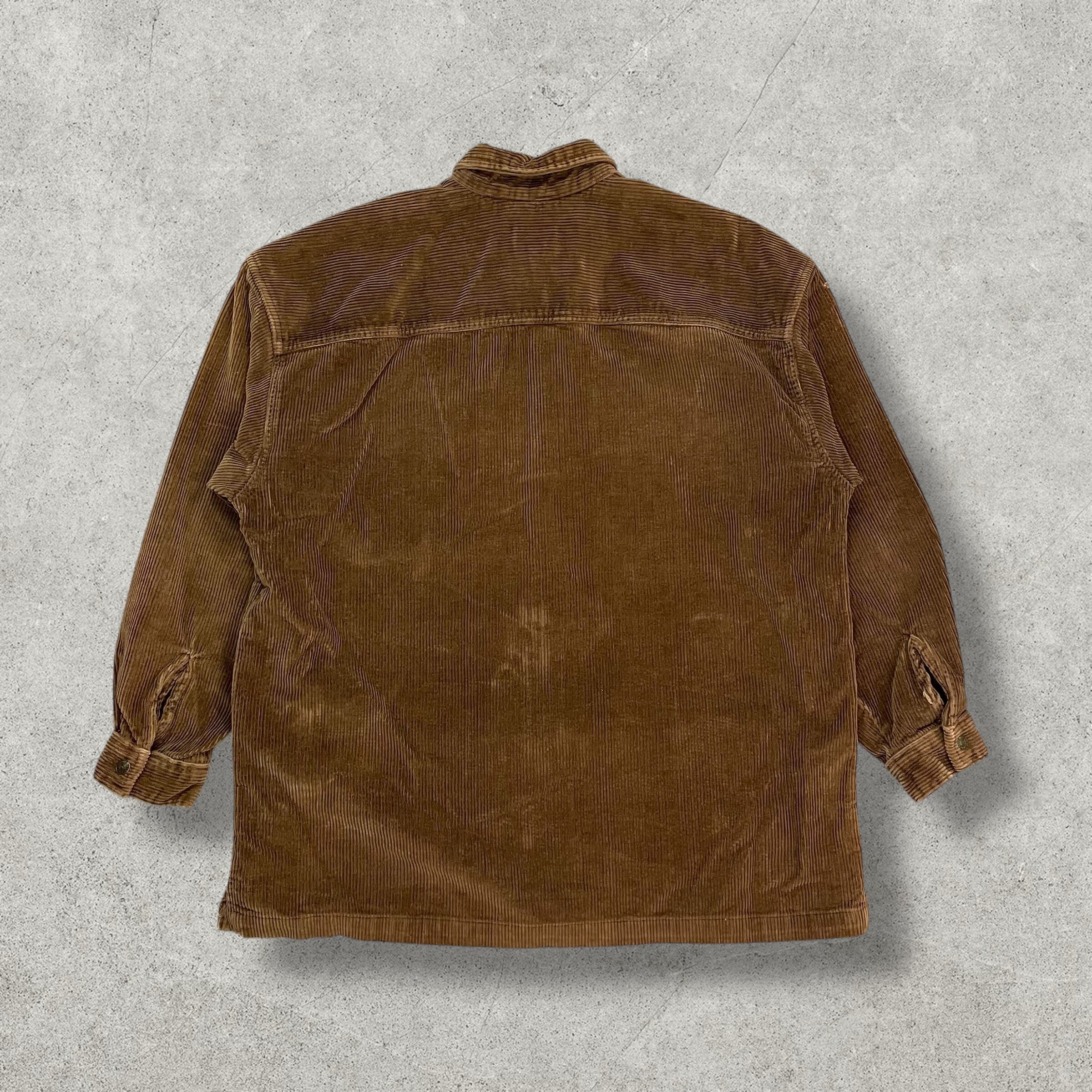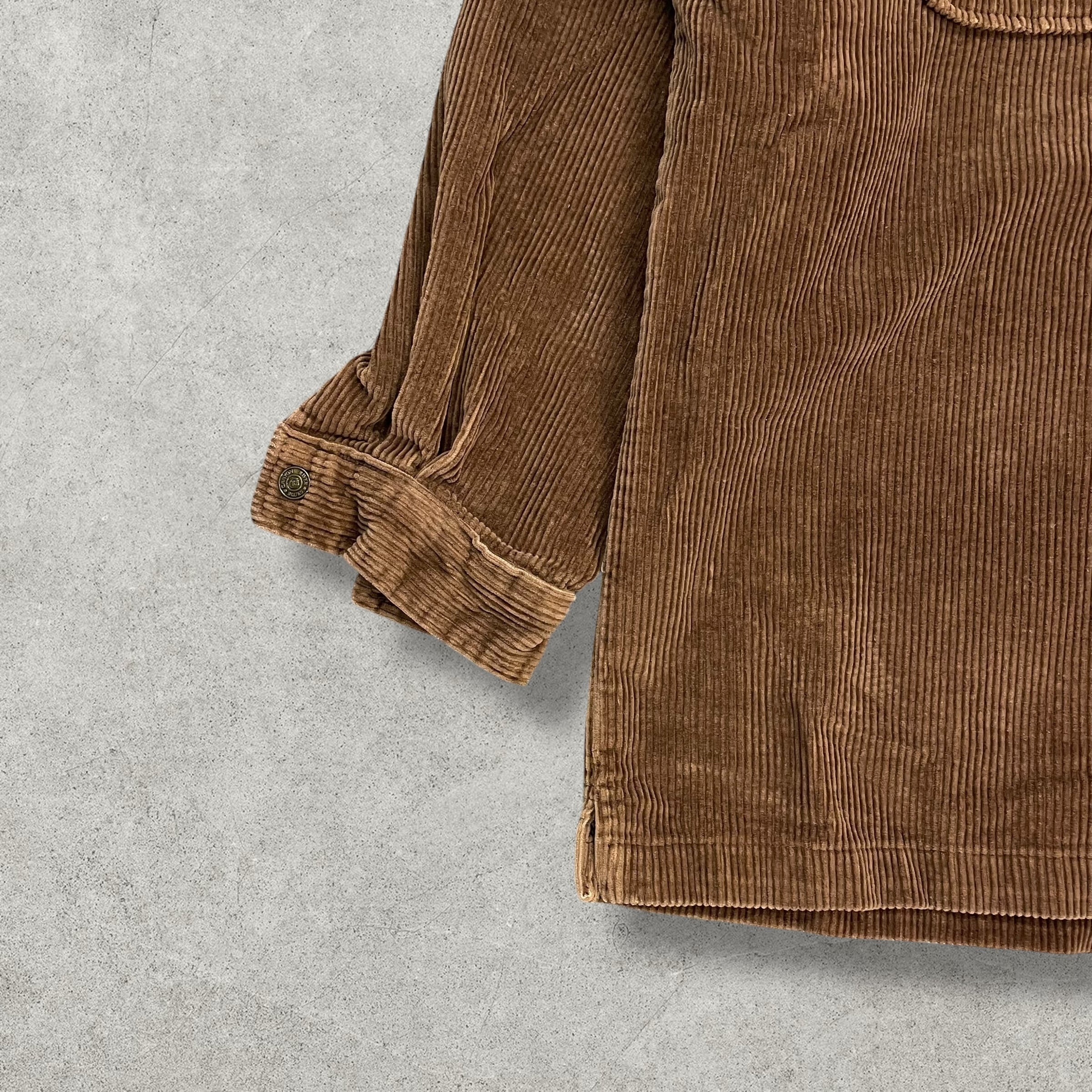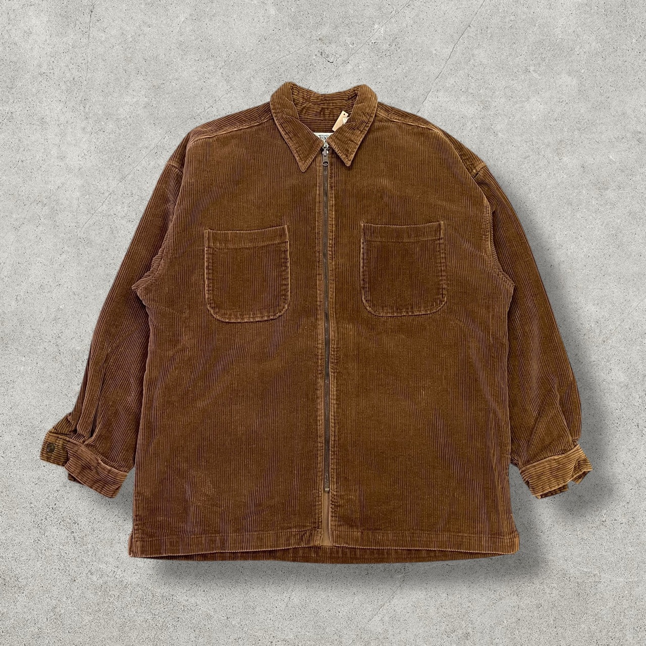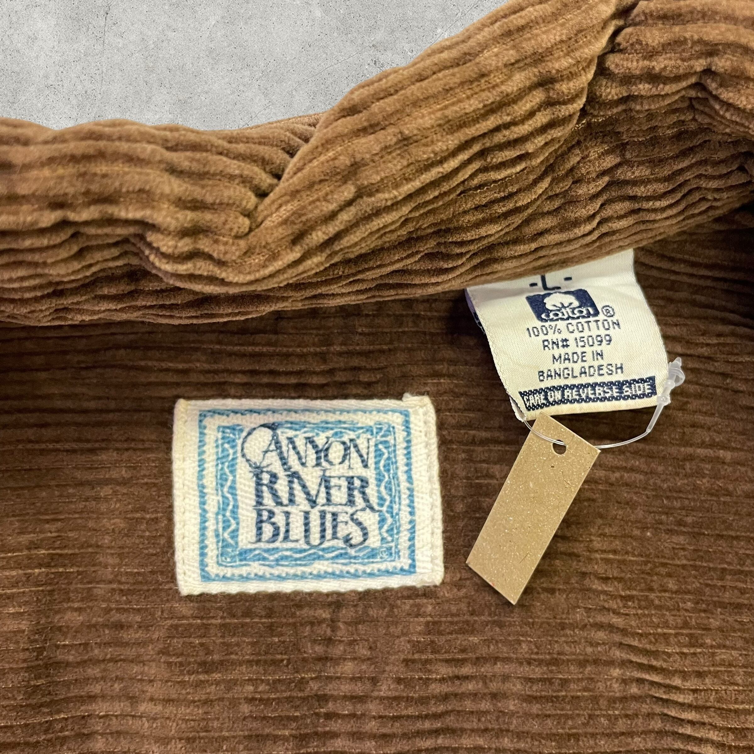 CANYON RIVER BLUES(キャニオンリバーブルース)の太畝コーデュロイジャケット。クラシックなブラウンカラーとゆったりとしたシルエットが特徴で、ジップアップ仕様・両胸のポケットがワークな雰囲気を演出。シャツジャケット感覚でライトアウターとしても着用できる万能アイテムです。コーデュロイ特有の風合いや擦れが全体にあり、古着らしい味を楽しめる一着。