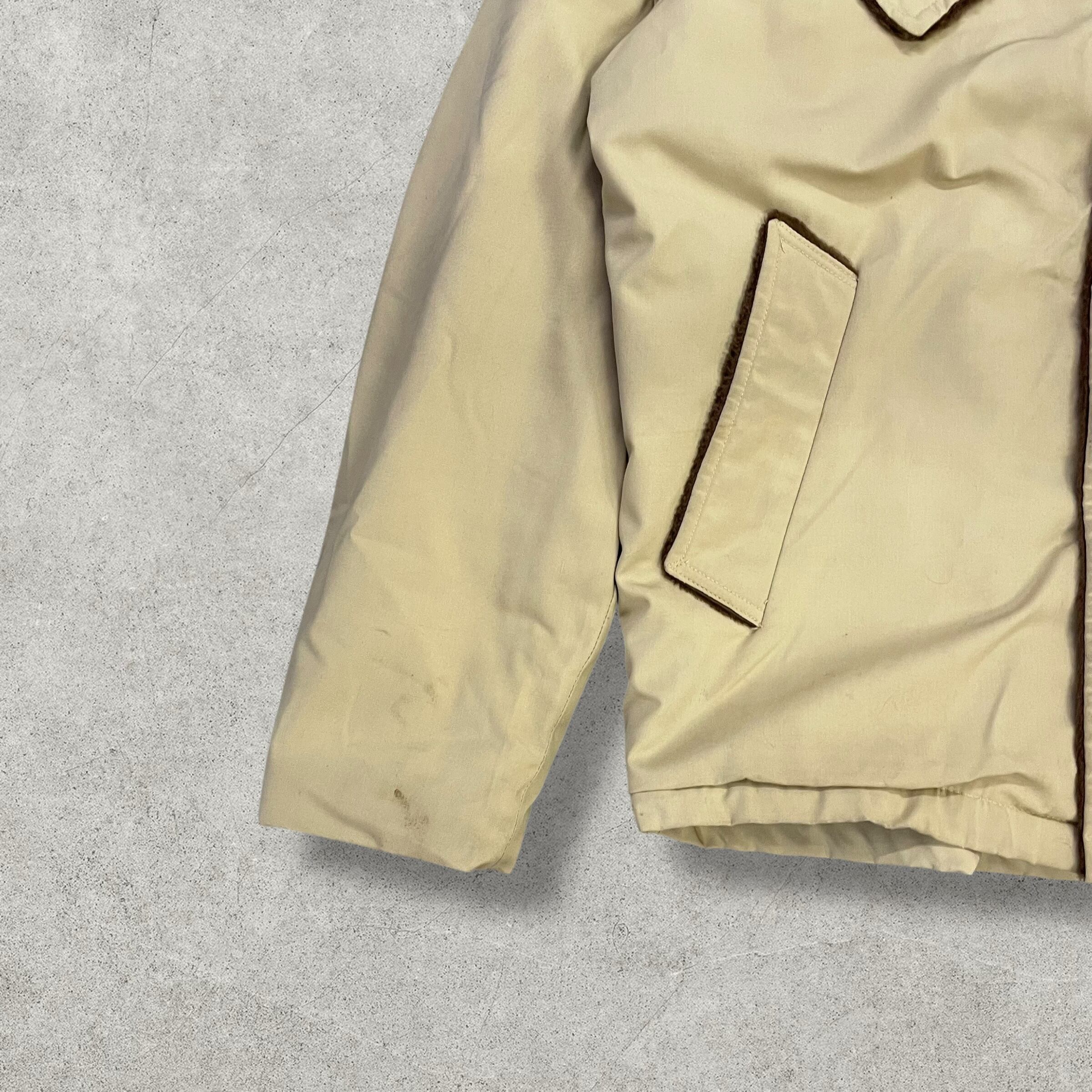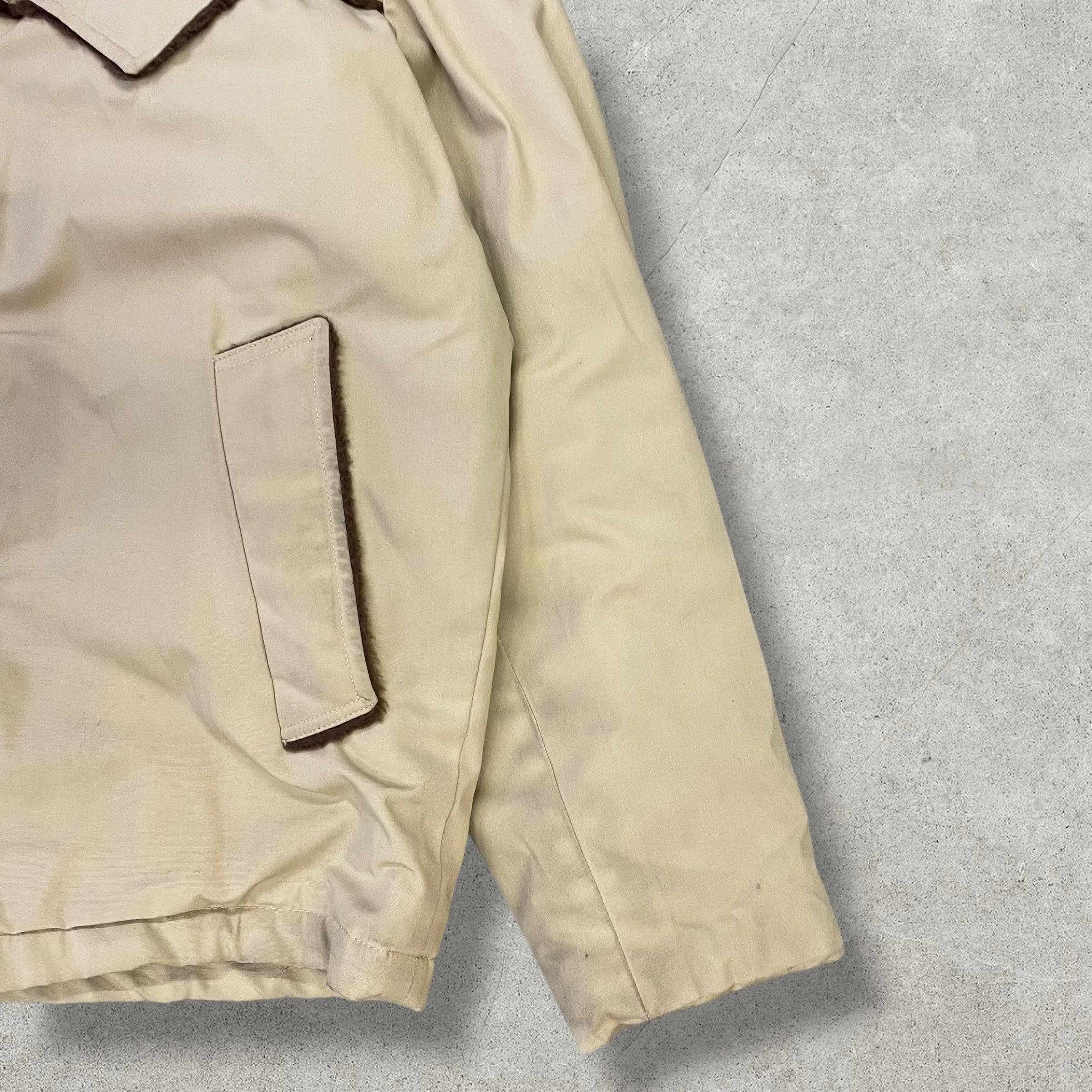 MILLER Western Wear(ミラー・ウエスタンウェア)によるヴィンテージジャケット。ベージュのボディにブラウンのフェイクファーがライニングされた、クラシックなウエスタンスタイル。肩から背中にかけてのヨーク切り替えや、ボアの襟・フラップポケットなど、当時らしいディテールが魅力。防寒性も高く、アウターとしてしっかり機能します。全体的に経年による薄汚れや擦れが見られますが、ヴィンテージらしい風合いとして楽しめる一着です。