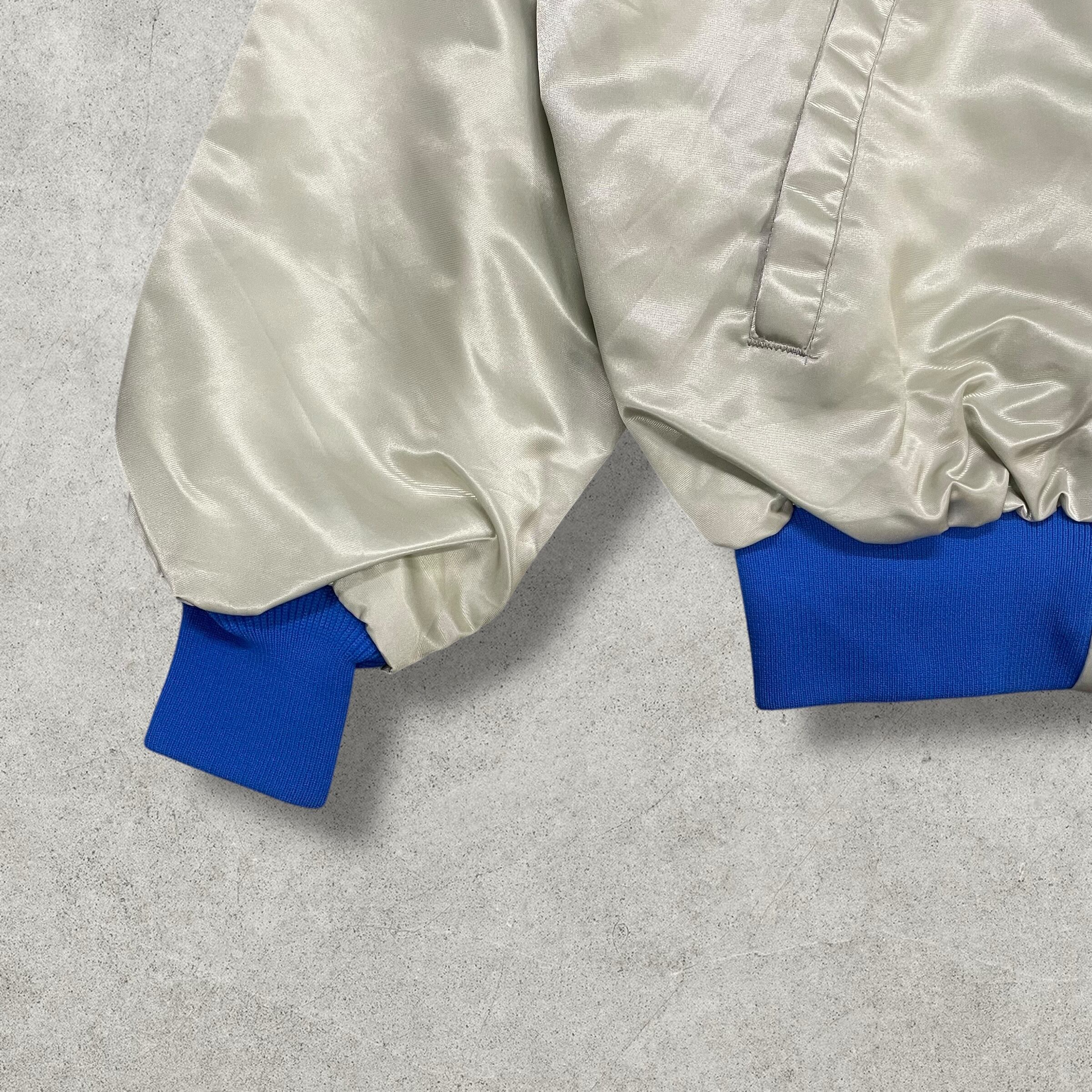 シルバー×ロイヤルブルーの配色が目を惹く「REGINA」サテンジャケット。フロントに縦に入ったロゴラインが印象的で、レトロスポーティな雰囲気漂う一着。光沢のある生地感とUSA製ならではのクラシックなシルエットが魅力。ストリートにもモードにもハマる万能アウター。