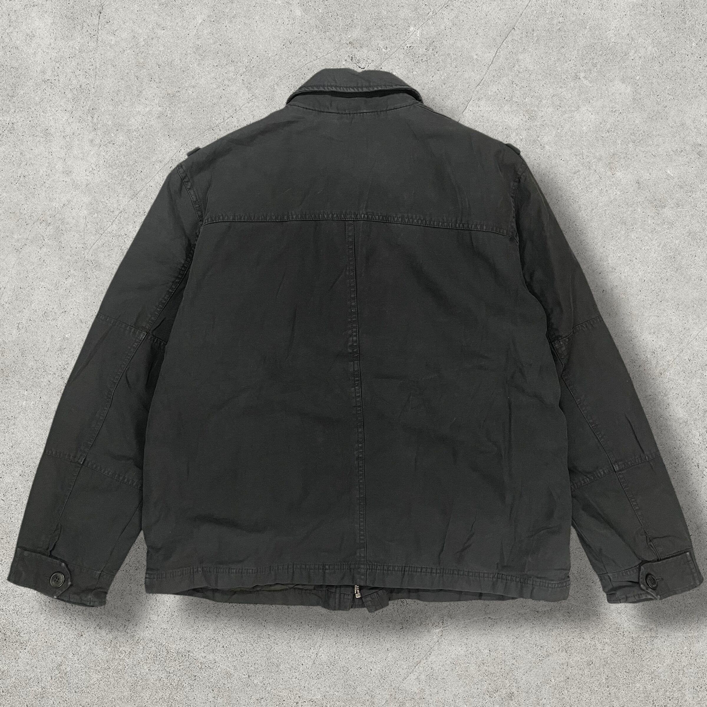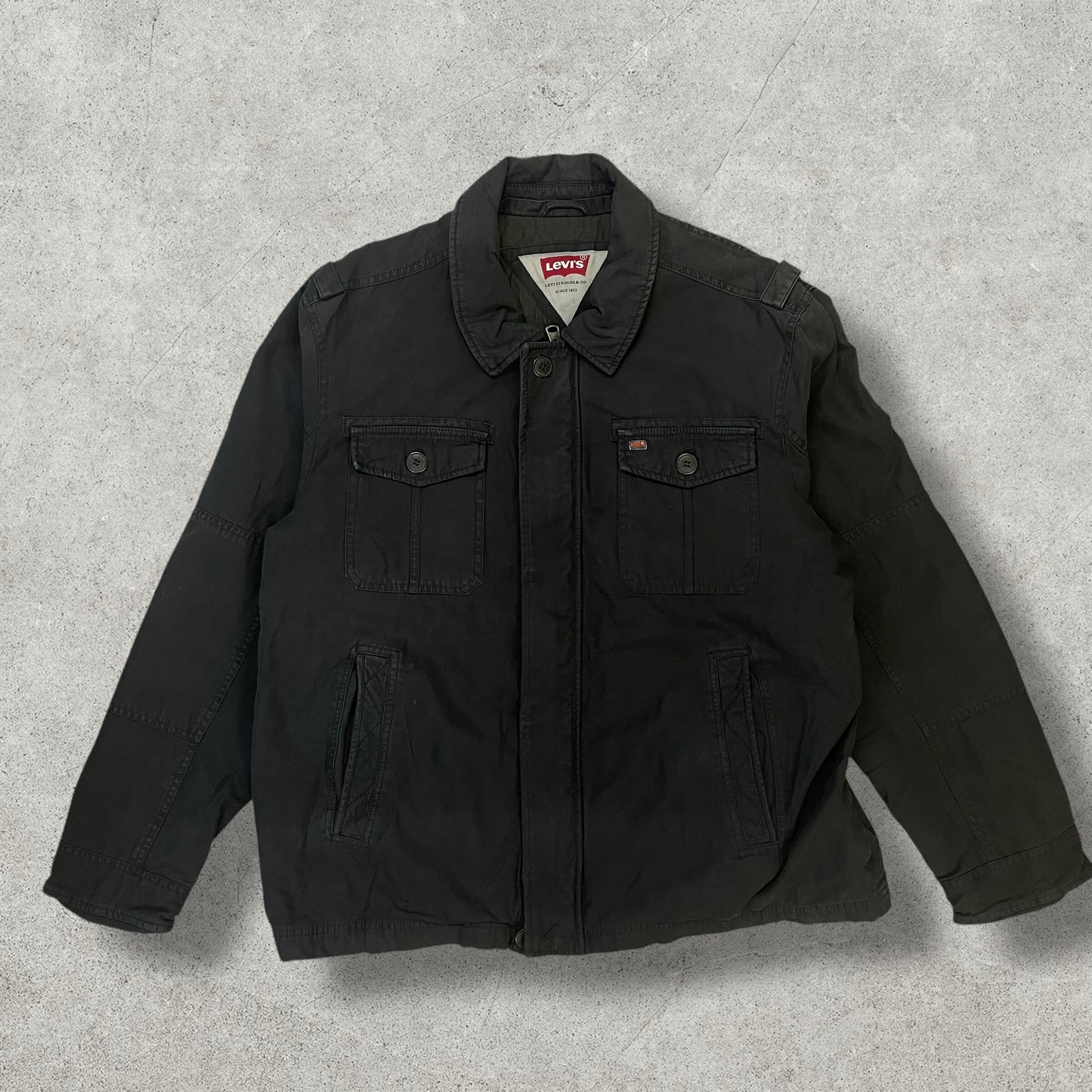 Levi’sのブラックミリタリージャケット。無骨なデザインながら、ややフェードしたブラックカラーがこなれ感を演出。胸ポケットやフロントのジップ+ボタン仕様がワークテイストな印象の一枚。インナーにスウェットやパーカーを合わせてもバランス◎。