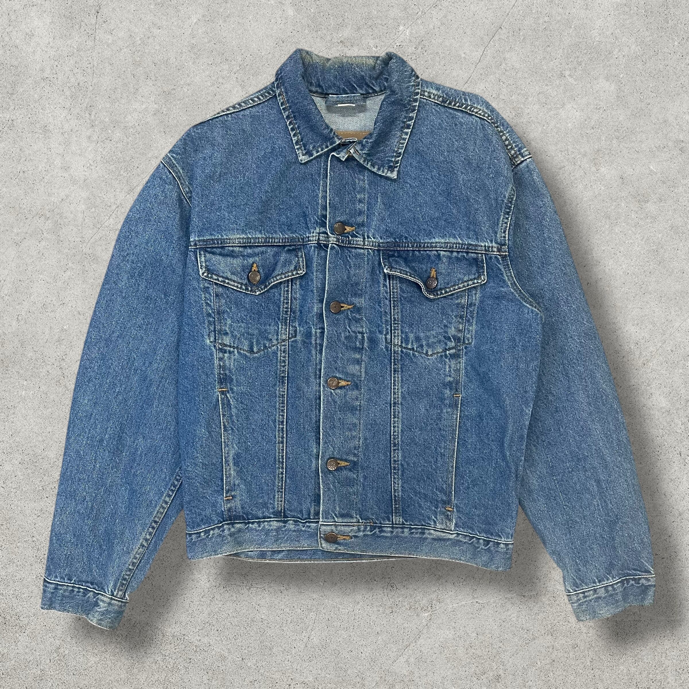 程よく色落ちしたライトブルーデニム。クラシックなトラッカージャケット型で、ゆったりとしたシルエットが魅力。古着らしい風合いを楽しめる一着。