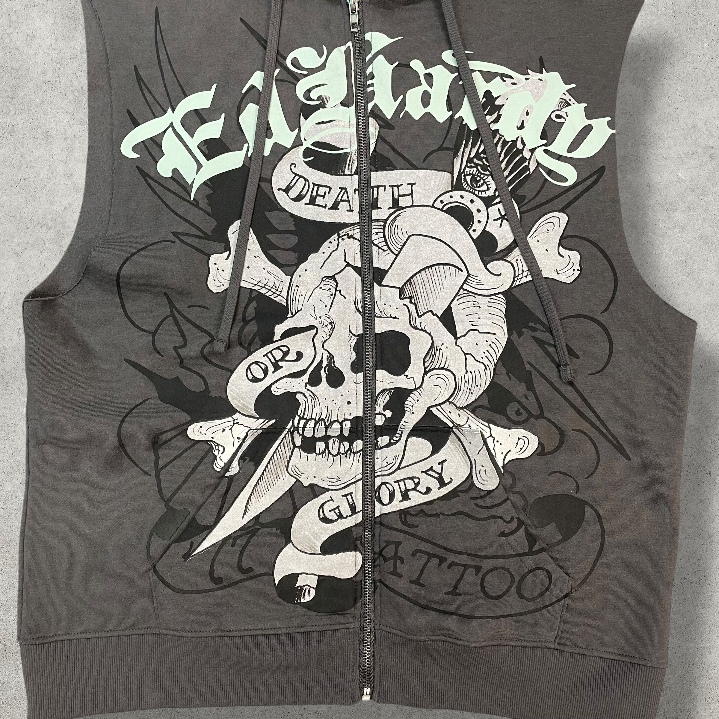 Ed Hardy “DEATH OR GLORY” スカルスリーブレスパーカー (charcoal)