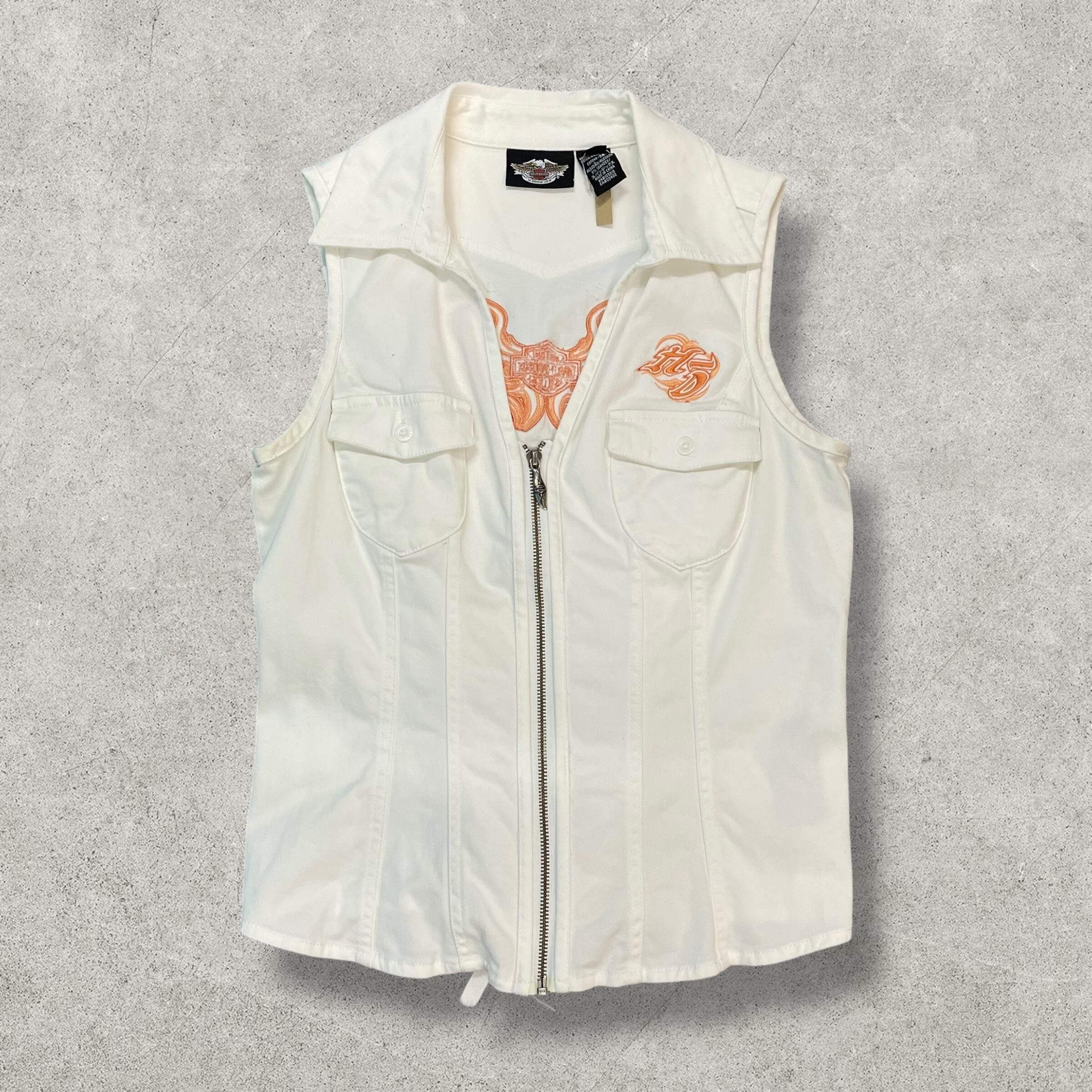 Harley-Davidsonの刺繍デザインが印象的なスリーブレスジップベスト。
