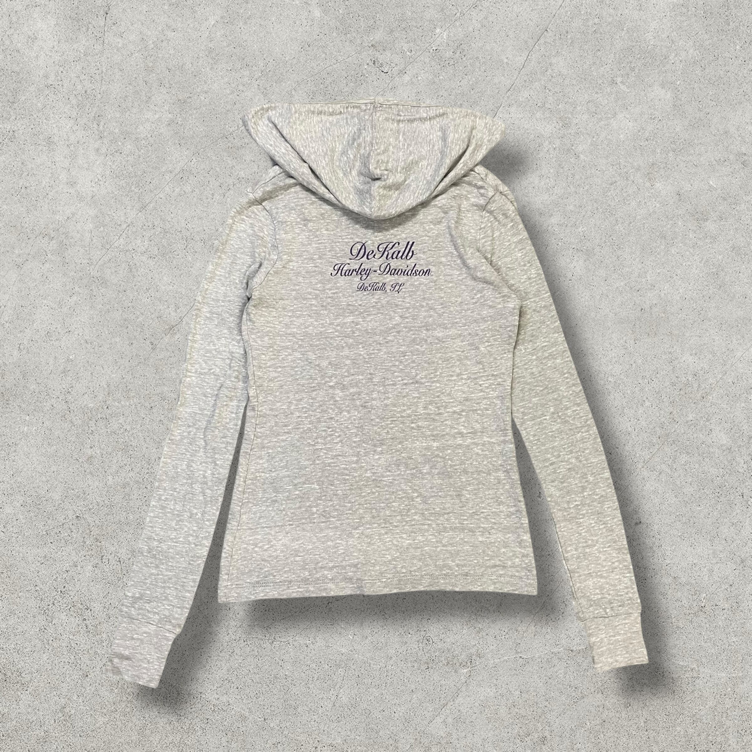 Harley-Davidsonのプリント入りロングスリーブ。フロントにはブランドロゴと“RIDE FREE”のメッセージ、バックには店舗ロゴが入った一枚。薄手のスウェット素材で、タイトなシルエットがY2Kスタイルやフェアリーグランジにもぴったり。深めのVネックとフード付きデザインが特徴的で、インナーとしてもレイヤードでも活躍するアイテムです。