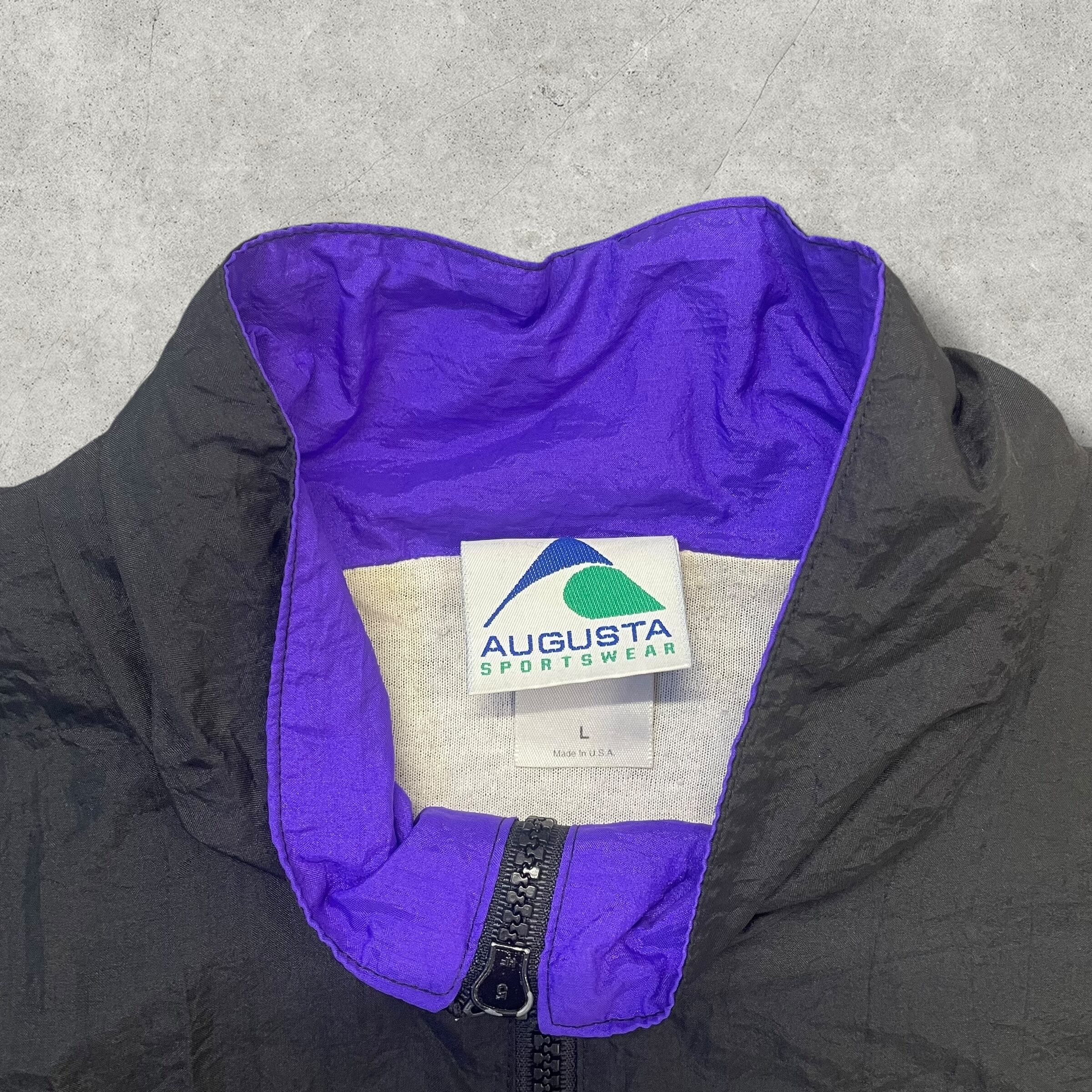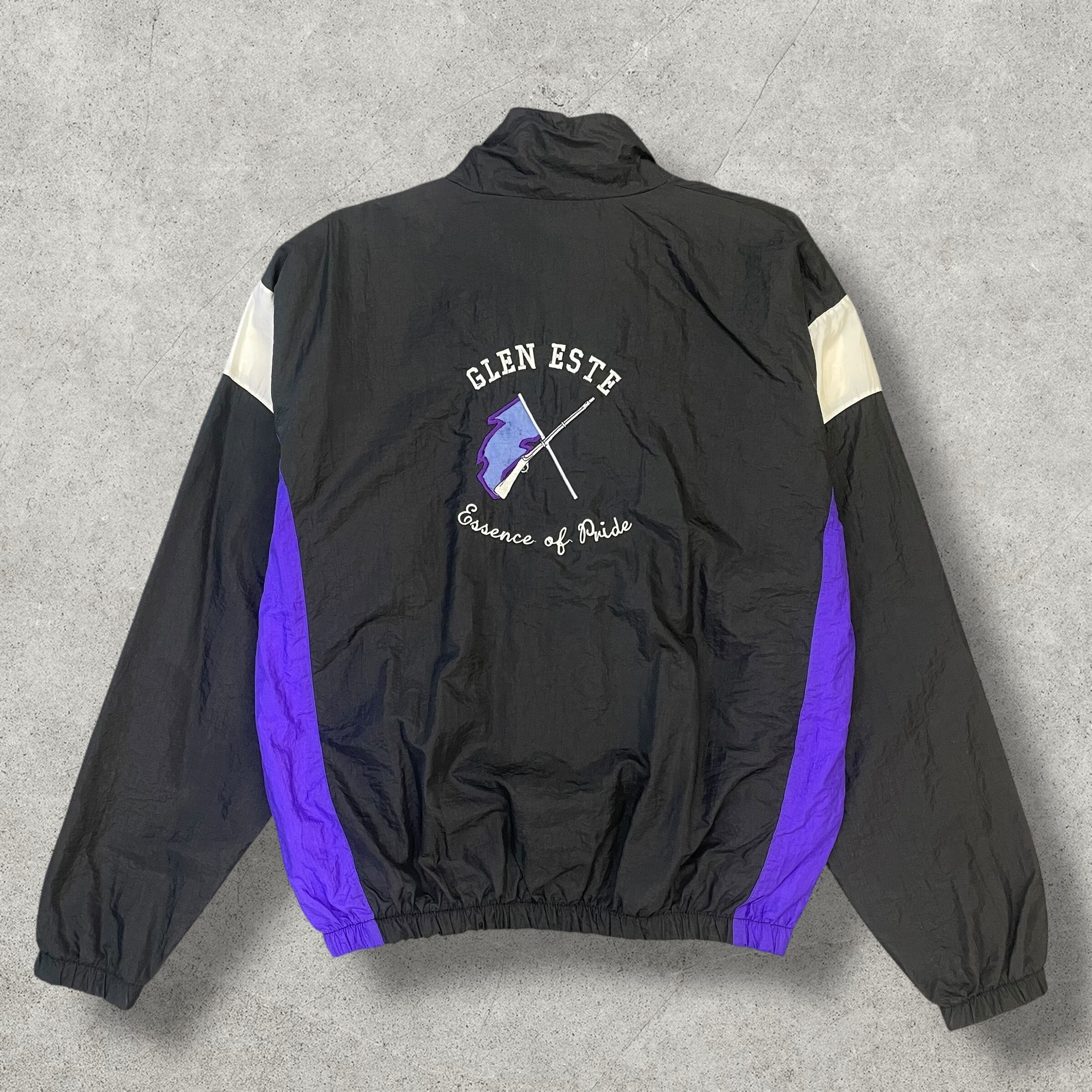 ブラック × パープルの切り替えが映えるアメリカ製ナイロンジャケット。胸元と背面に“GLEN ESTE Band”の刺繍ロゴが入り、チームジャケットらしい存在感あるデザイン。軽量で扱いやすく、古着ミックスにもスポーティなコーデにも合わせやすい一枚です。