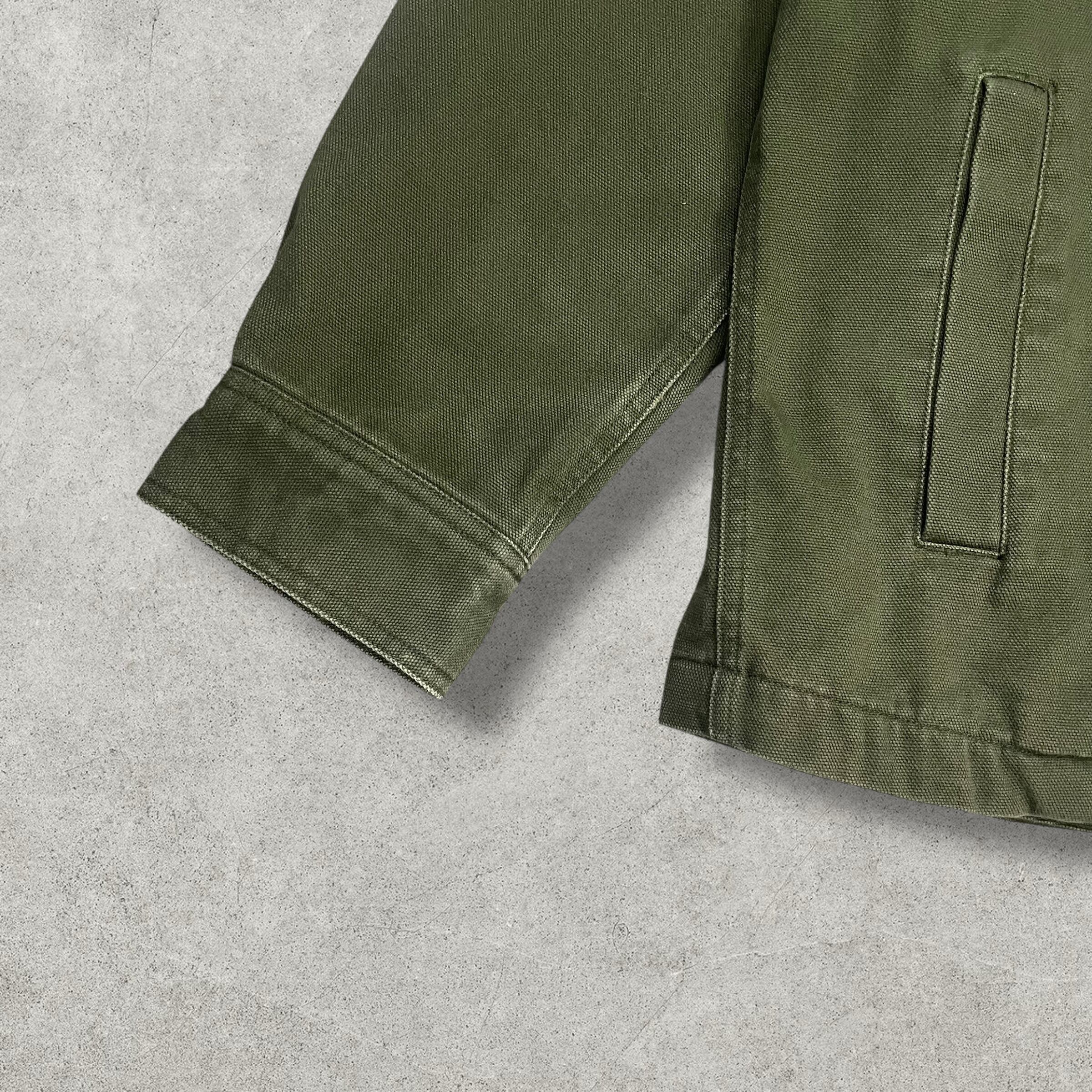 厚手のヘビーツイル生地を使用した、シャツとジャケットの中間的なワークアウター。無骨な4ポケット仕様で機能性も高く、深いオリーブカラーがミリタリー好きにもハマる一着。2XLのゆったりシルエットで、ざっくり羽織るだけで雰囲気抜群。