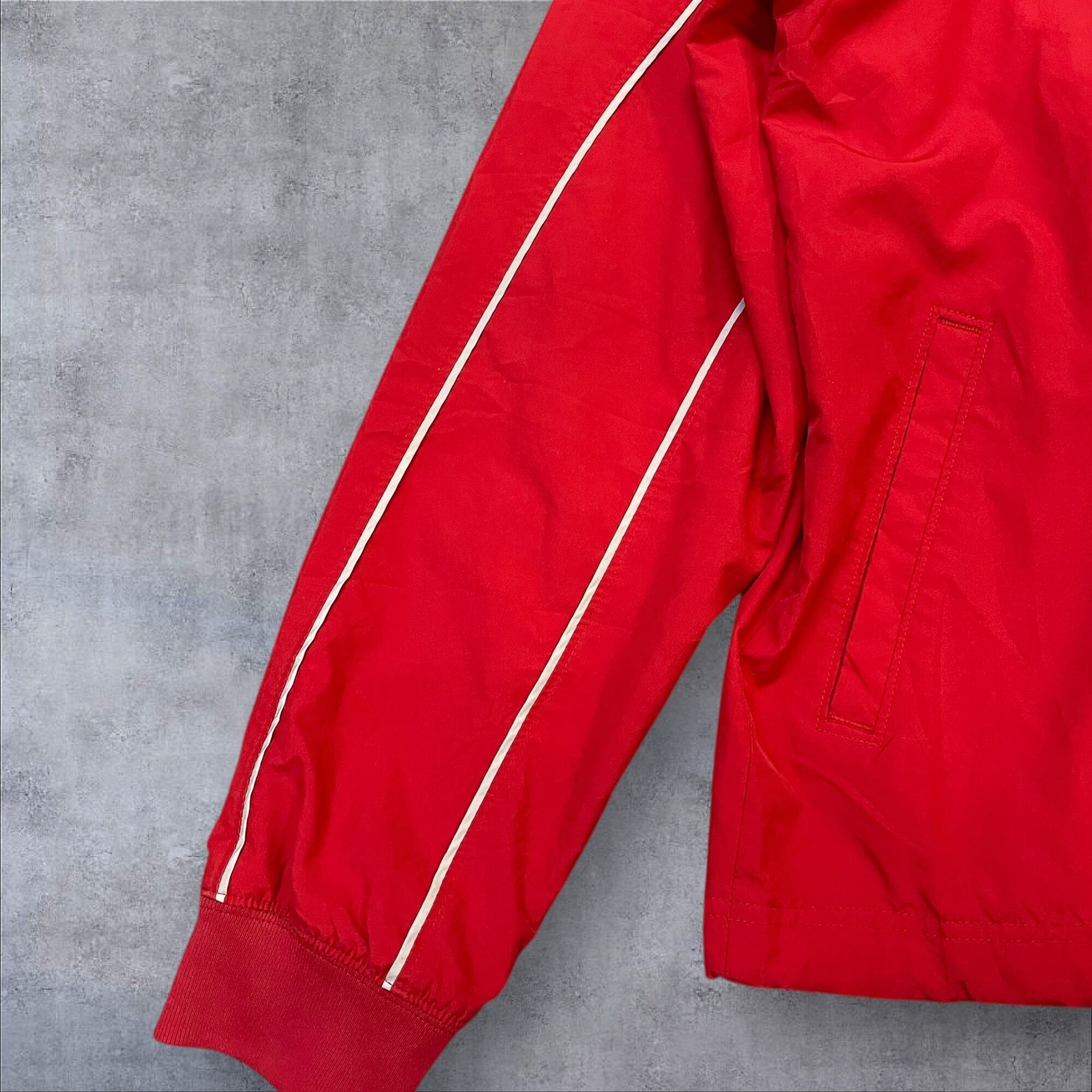 鮮やかなレッドにホワイトのパイピングが映えるスポーティーなトラックジャケット。胸元のNIKEロゴがアクセントになり、軽量ナイロンで気軽に羽織れる万能アイテム。ストリートにもY2Kスタイルにも相性抜群で、ユニセックスで着用しやすい一枚です。
