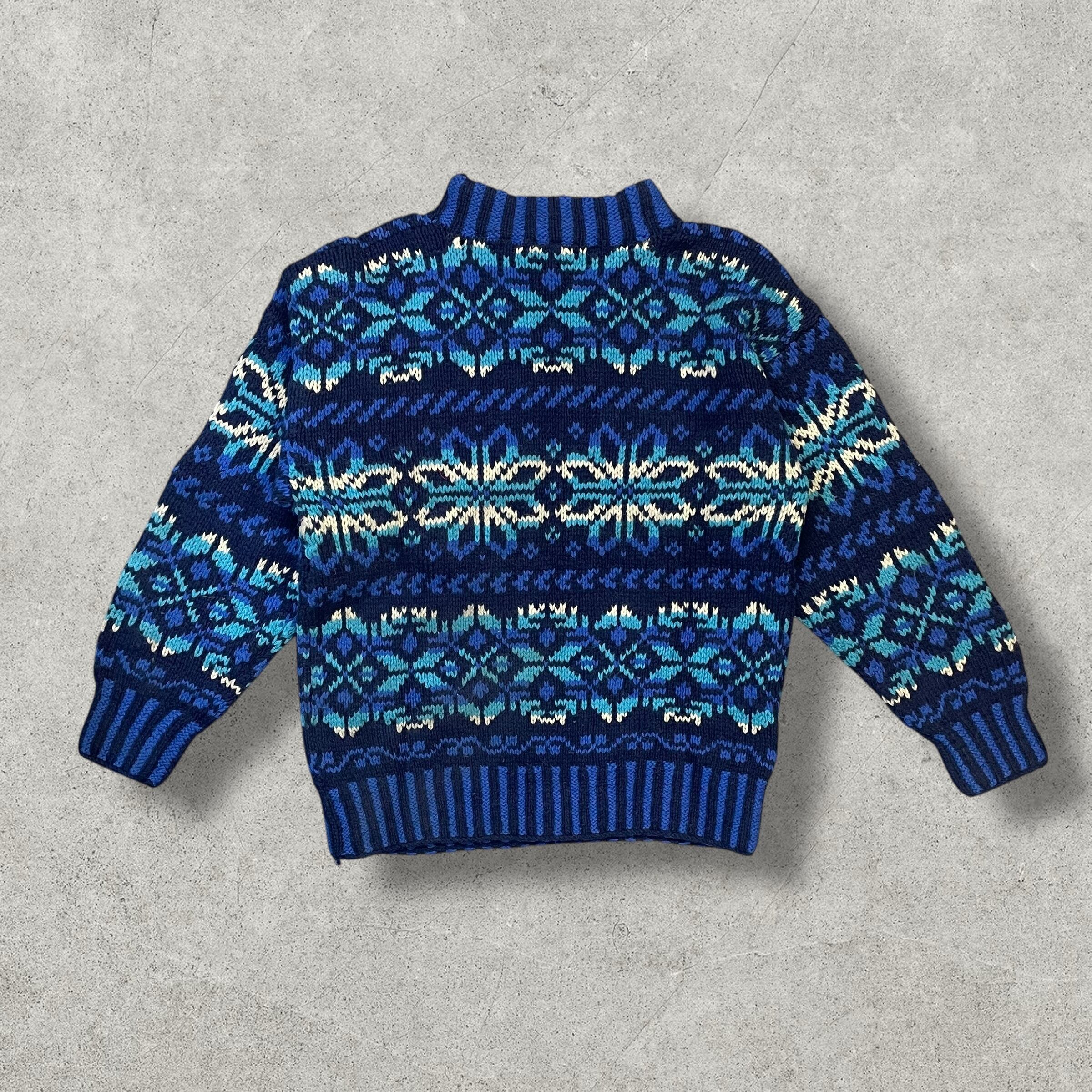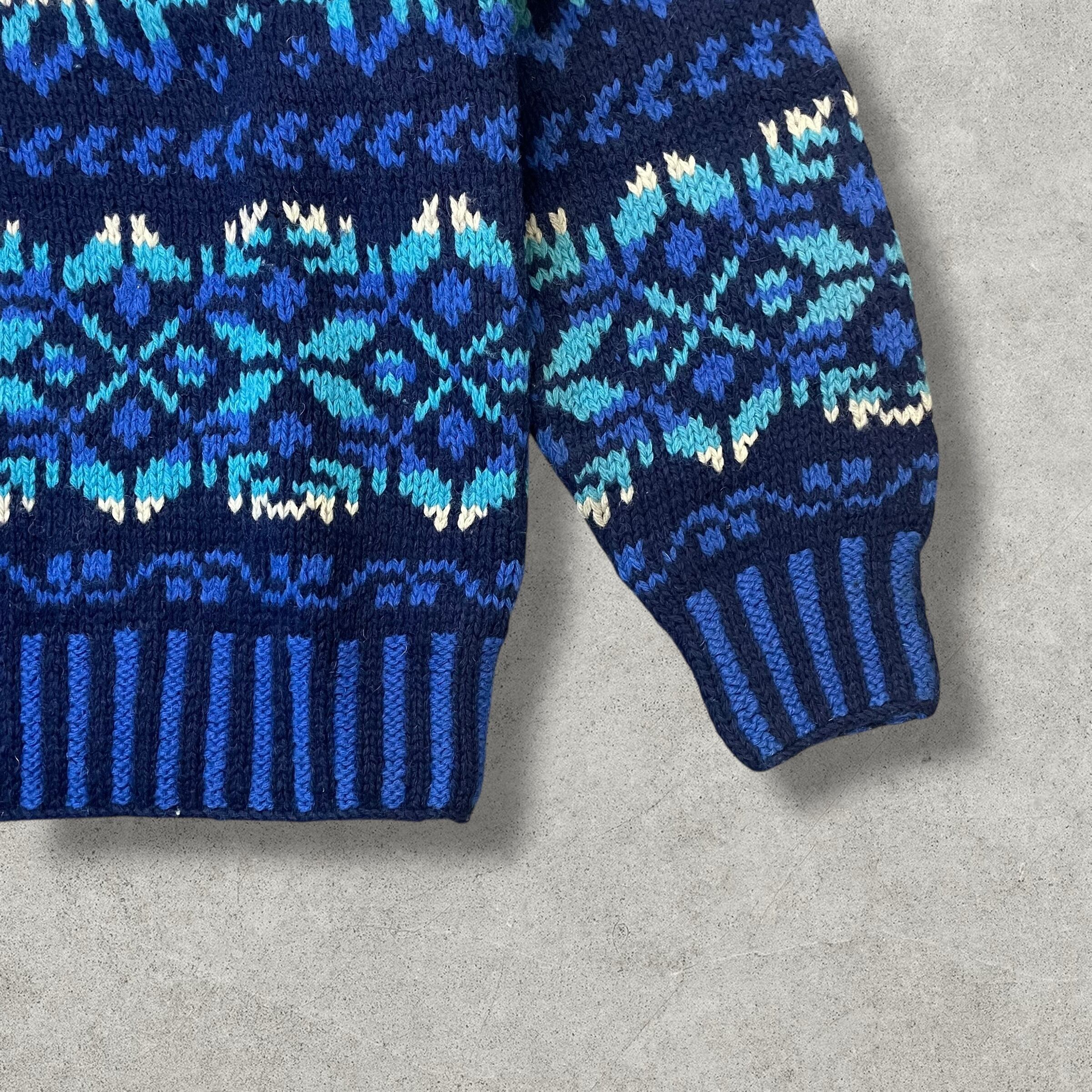 ネイビー×ブルーのグラデーションが美しい本格シェットランドウールニット。ノルディック調の多色編みパターンが存在感抜群で、コーデの主役になる一枚。肉厚であたたかく、冬のスタイルをぐっとクラシックに仕上げてくれるアイテムです。
