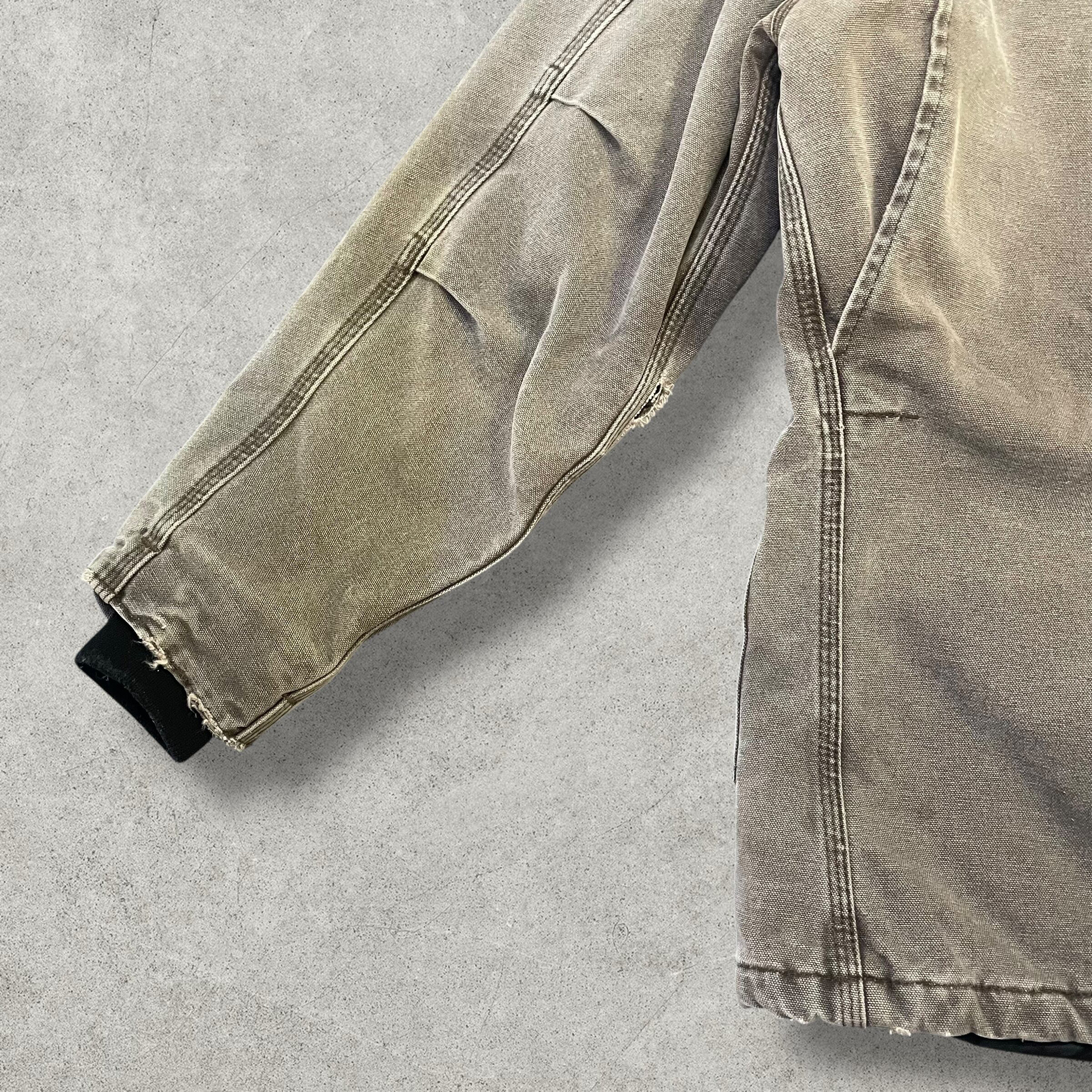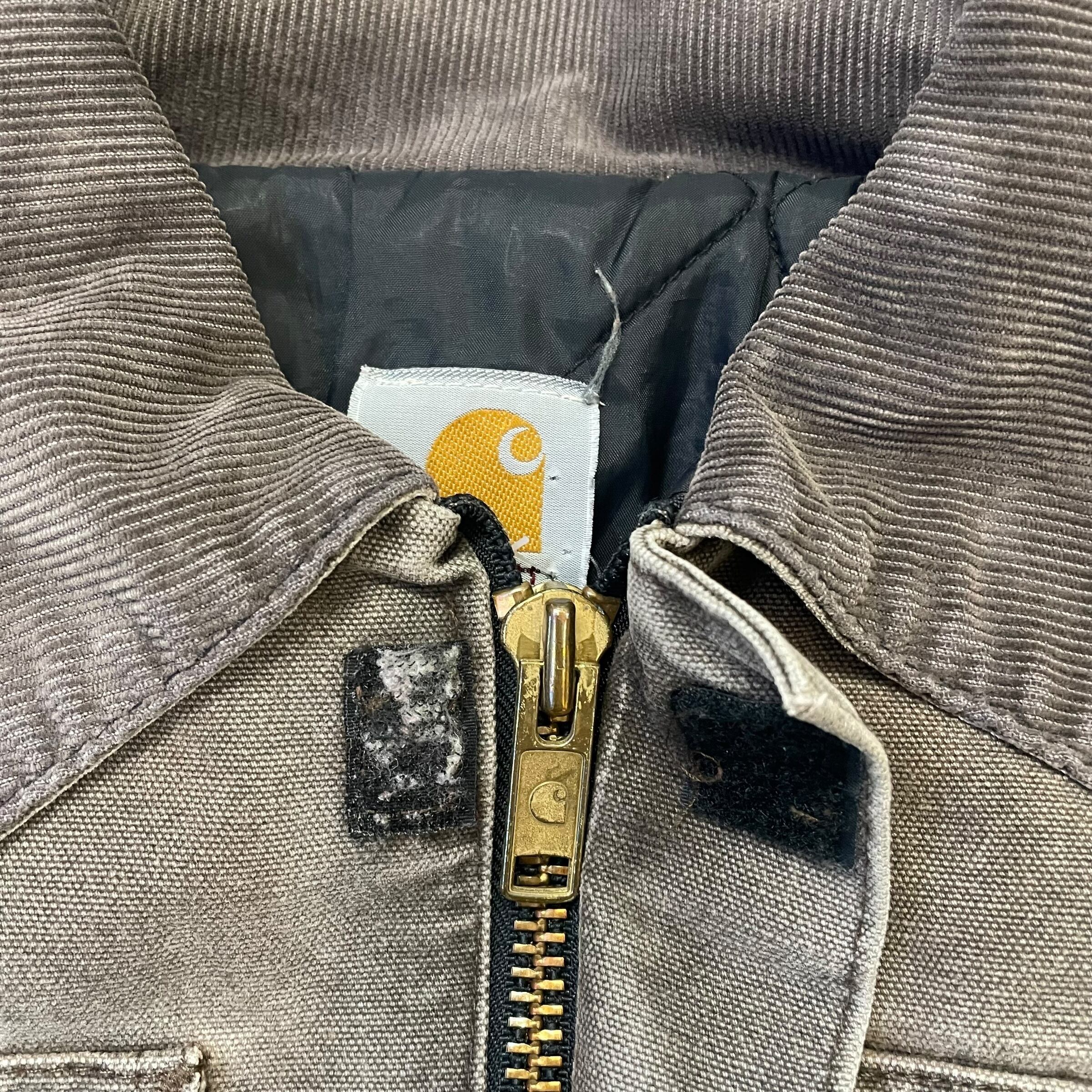 Carharttらしいヘビーオンスのダック地を使用したワークジャケット。全体的にフェードしたブラウン系カラーが雰囲気抜群で、リアルワーク由来のアタリや色ムラが一点物らしい表情を作っています。襟はコーデュロイ切替、フロントはジップ仕様、内側はキルティングライナー付きで防寒性も◎。袖口リブや縫製のパッカリング、擦れなども含めて無骨な魅力として楽しめる一着。ストリート・ワーク・古着ミックスどれにもハマる完成度の高いアイテムです。