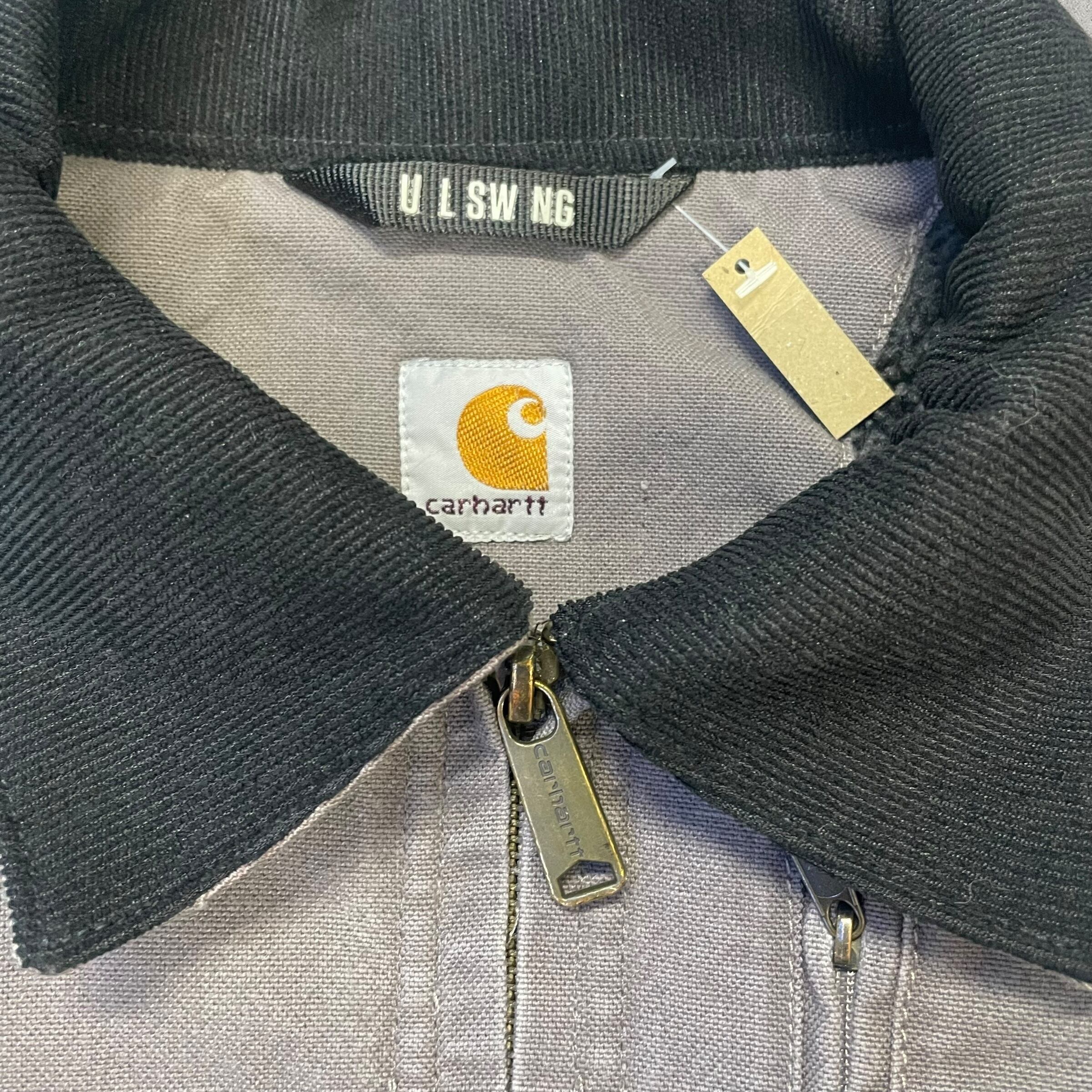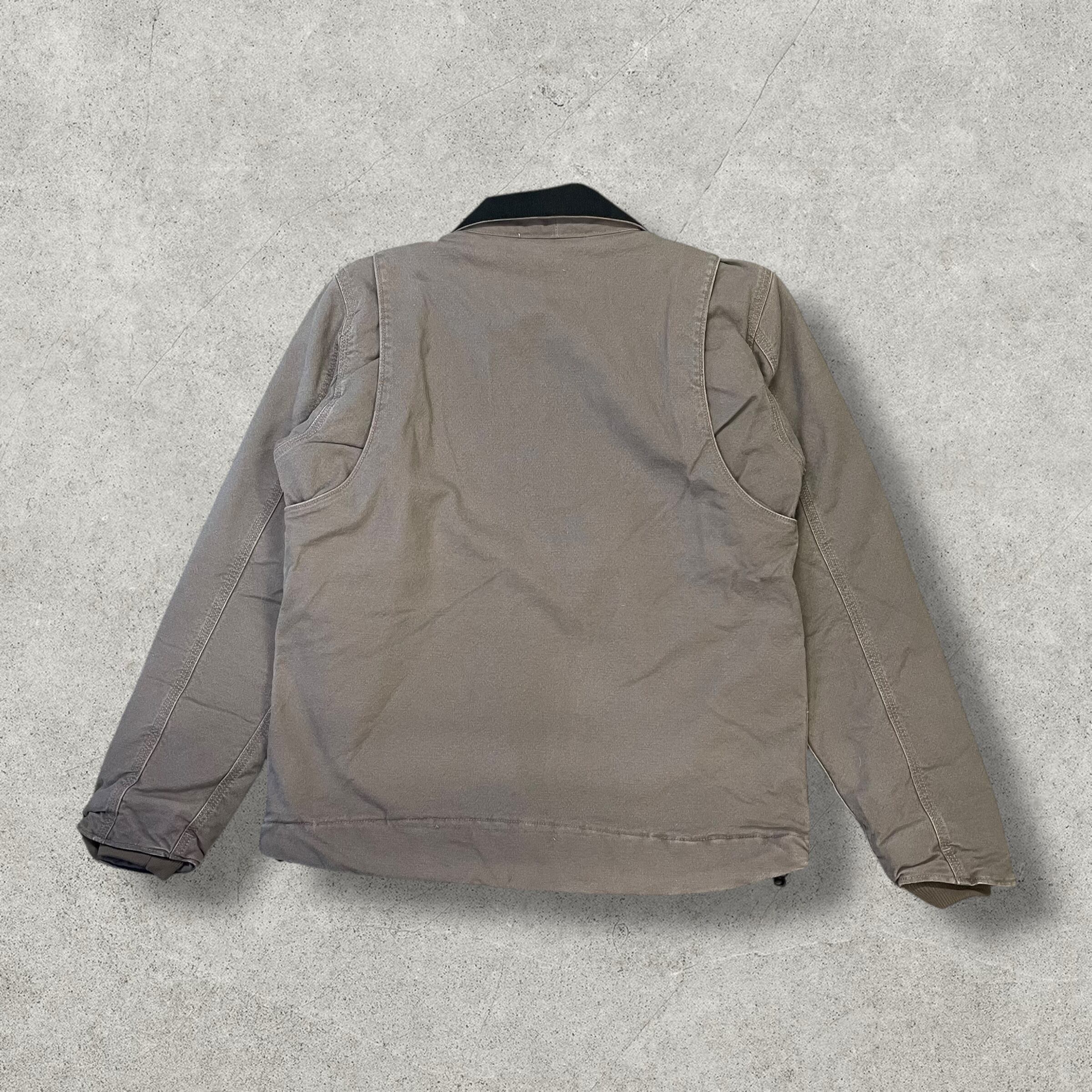 Carharttの定番ダック地を使用したワークジャケット。グレーブラウン系の落ち着いたカラーで、全体に程よいフェードと着用感があり、ワークウェアらしいリアルな雰囲気が魅力の一着です。襟はブラックのコーデュロイ切替、フロントはジップ仕様。内側はボアライナーになっており、防寒性もしっかり確保されています。裾にはドローコード付きでシルエット調整も可能。シンプルながら無骨さのあるデザインで、ストリートから古着ミックスまで幅広く使えるアイテムです。